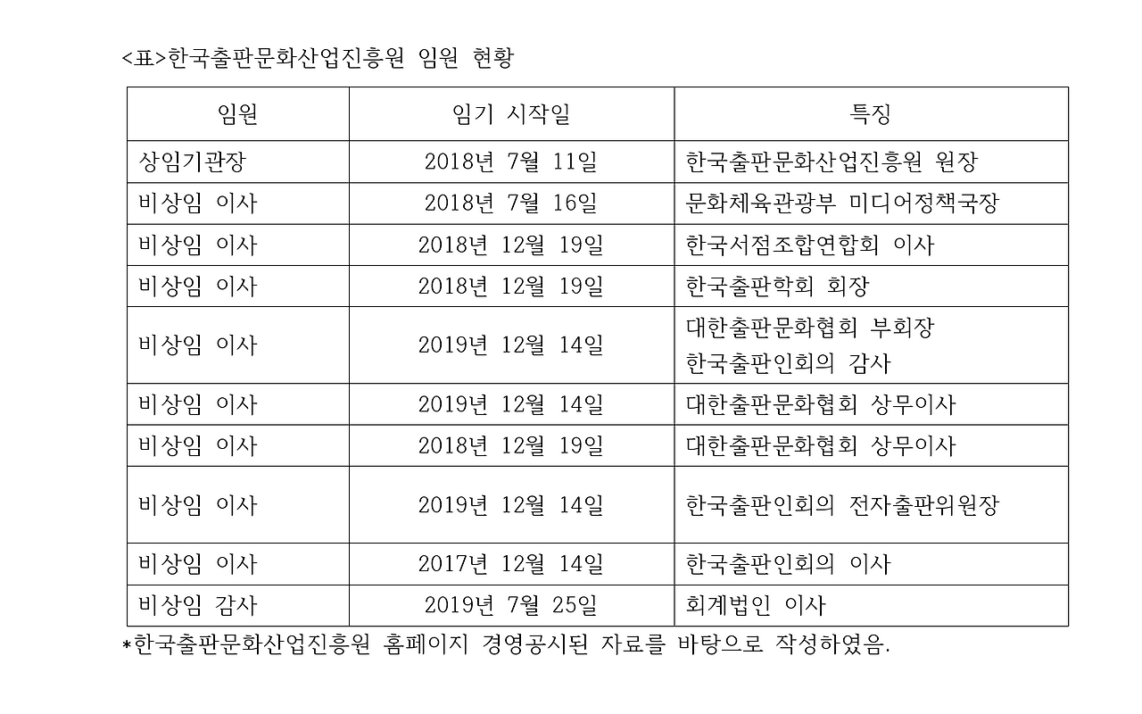 그러나 2대 원장이 임기 만료 전에 사퇴한 이후 출판진흥원의 임원은 특정 이익단체 중심으로 구성되고 있다. 출판진흥원은 출판, 인쇄, 독서진흥, 학회 등 다양한 의견을 수렴할 수 있는 임원 구성이 필요하다. 비상임이사는 출판진흥원 임원추천위원회의 채용 절차에 따라 문화체육관광부 장관이 임면한다.
