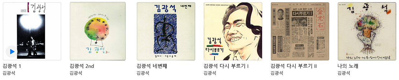 왼쪽부터 김광석 정규 1집 [김광석 1] (1989), 정규 2집 [김광석 2nd] (1991), 정규 4집 [김광석 네번째] (1994), 다시 부르기 1집 (1993), 다시 부르기 2집 (1995), 정규 3집 [나의 노래] (1992)이다.