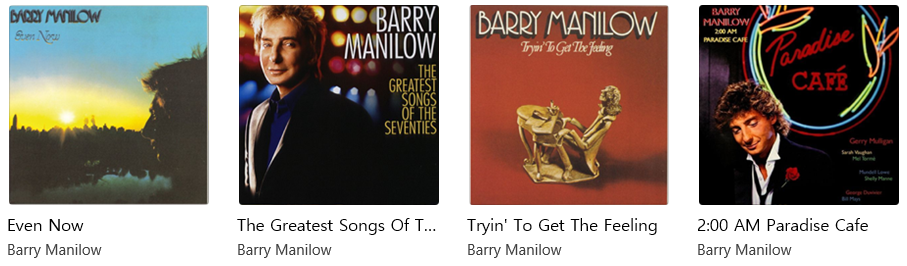 왼쪽부터 [Even Now] (1978), [The Greatest Songs Of The Seventies] (2007), [Tryin' To Get The Feeling] (1975), [2:00 AM Paradice Cafe] (1984)이다.