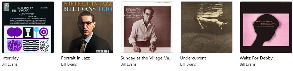 왼쪽부터 앨범 [Interplay] (1963), [Portrait In Jazz] (1960), [Sunday at the Village Vanguard] (1961), [Undercurrent] (1962), [Waltz For Debby] (1962)이다.