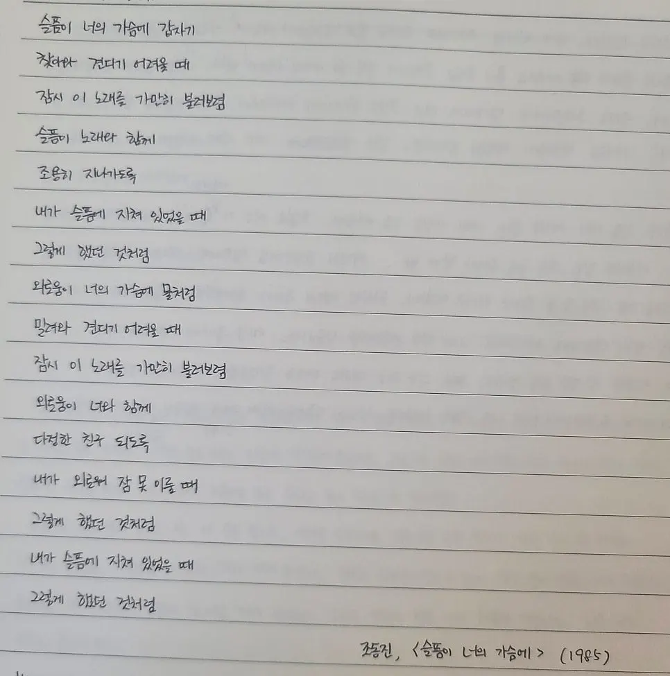 그는 노래 말미에 항상 '내가 ~ 그렇게 했던 것처럼'이라는 구절을 덧붙인다. 슬프고 외로운 사람끼리는 서로를 알아보는 걸까. 내가 슬픔과 외로움 앞에서 어쩌지도 못하고 서성이는 모습을 그는 먼발치에서 바라보고 있었을 테다. 그리고 지금, 만신창이가 된 내 옆으로 슬그머니 다가와 노래로 나를 위로한다.