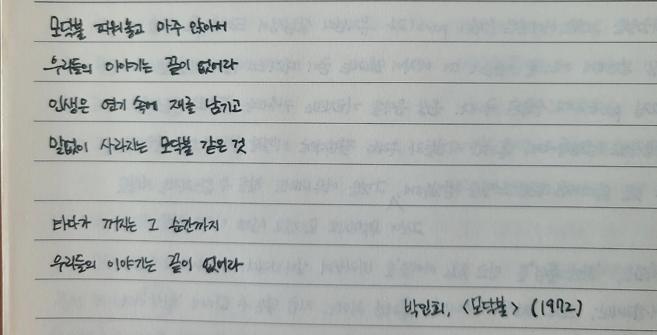 '모닥불'은 삶이다. 생을 시작한 이후 우리는 혼자였던 적이 없다. 상대가 누구이건 '마주 앉아', '이야기'할 수밖에 없다. 그리고 이야기는 '끝도 없이' 이어진다. 지치고, 질리고, 가끔 그립기도 하며.