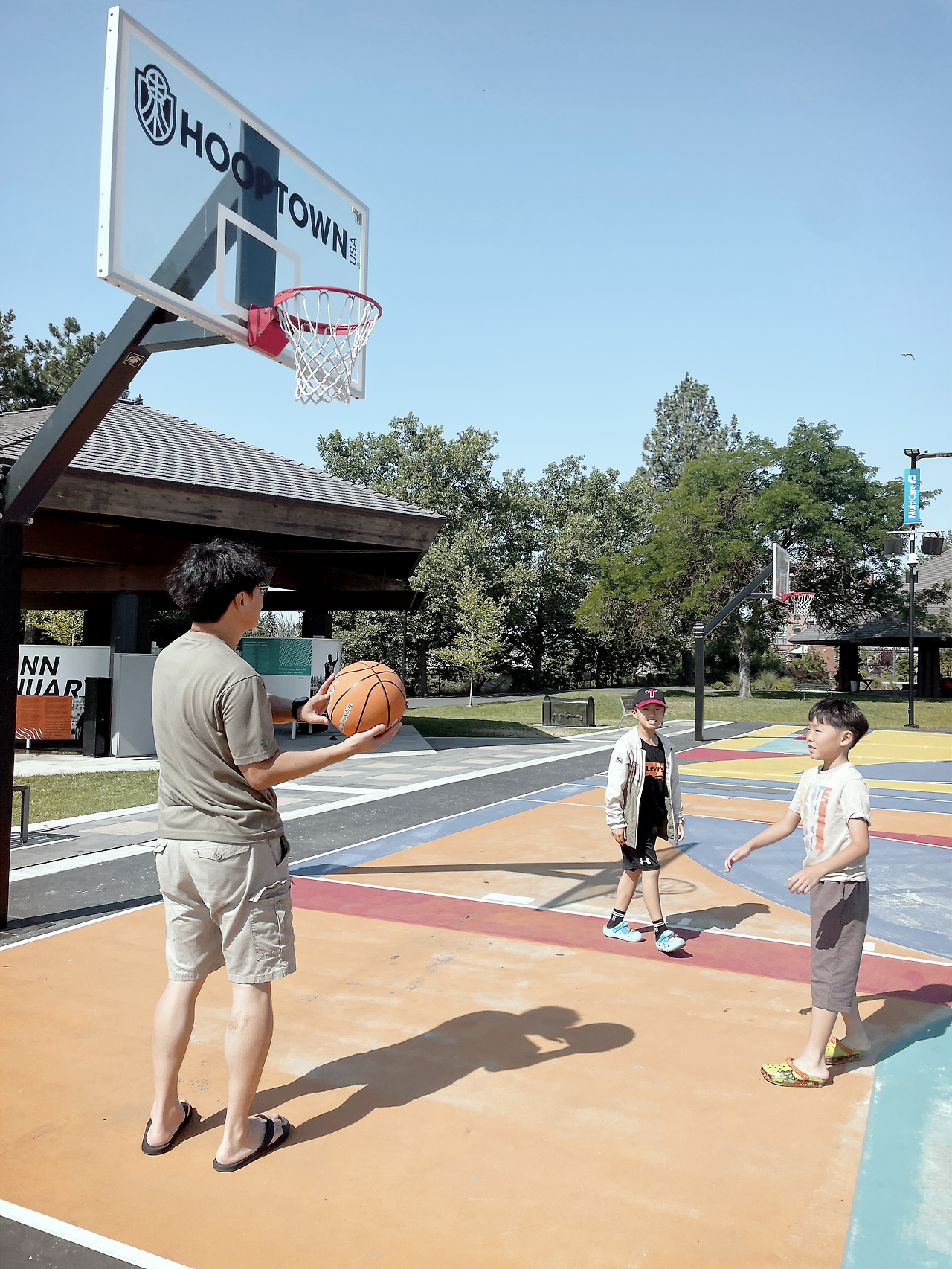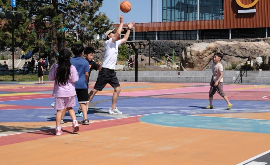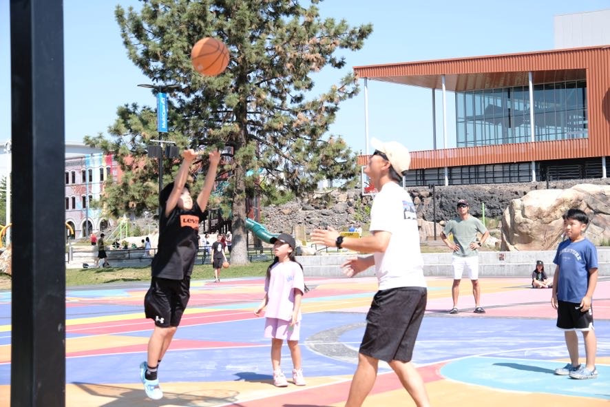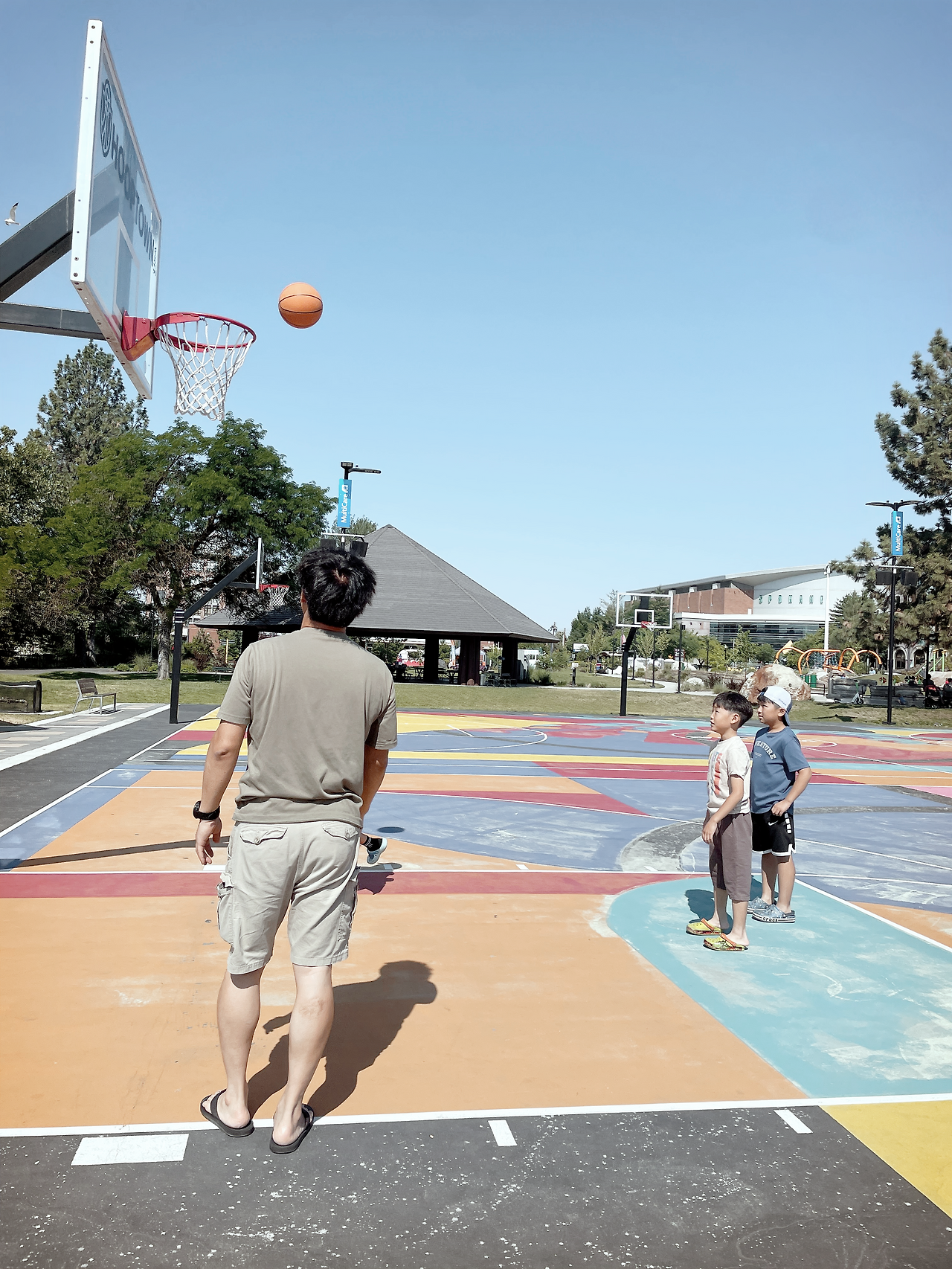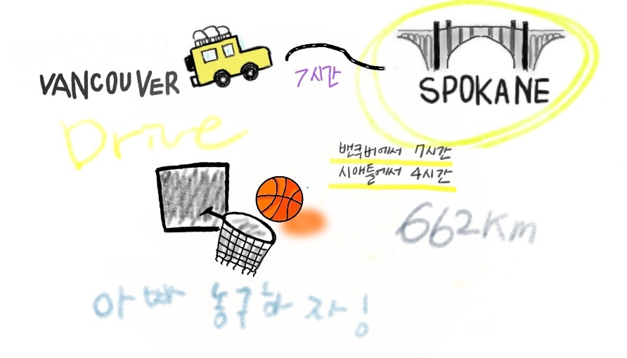 나는 스포캔 호텔에서 아침밥을 먹고 형들과 같이 농구장으로 갔다. 농구장은 호텔 바로 옆에 있었다. 농구장 바닥이 알록달록 멋진 색깔이었다. 우리는 함께 농구 연습을 한 뒤 아빠들과 3 대 3으로 대결을 했다. 우리는 열심히 하였지만 게임에서 졌다. 다음에는 꼭 이기고 싶다. 날씨가 더워서 힘들었다. 그래도 형들과 같은 팀이어서 너무 재미있었다. 형들이나 친구들이랑 할 때는 몸이 불타오른다. 나는 아빠랑 같이 했던 운동중에서 농구와 축구가 가장 재밌었다. 아빠랑 또 같이 하고 싶은 운동은 야구와 탁구이다.