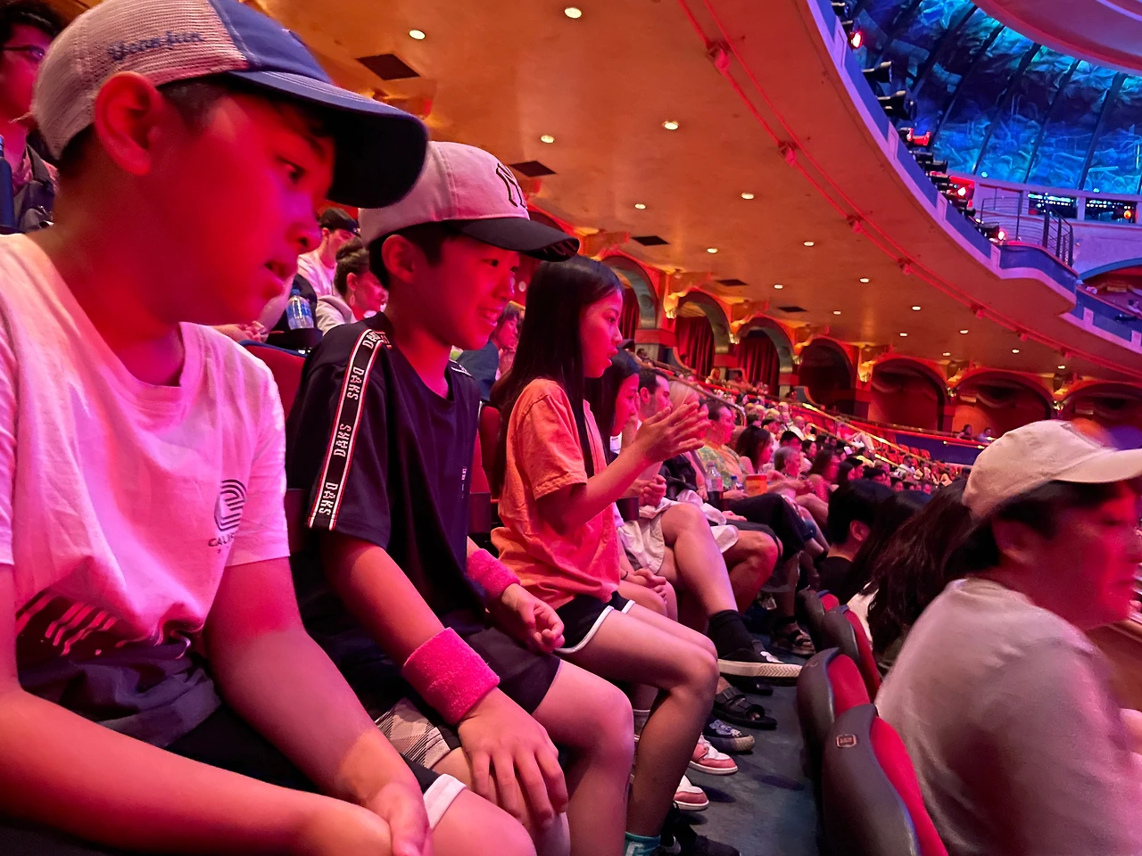 우리는 오늘 공연을 보러 가기로 했다. 서연이 언니네는 다른 공연을 보기 위해서 아침부터 저녁까지 못 봤다. 우리는 일단 밥을 먹으러 뷔페에 갔다. 크레이프랑 아이스크림이 있어서 좋았다. 우리는 밥을 먹고 공연을 보러 가서 티켓을 샀다. 쪼이는 거기에 못 들어가서 서연이 언니네한테 맡겼다. 처음에 쇼를 시작할 때 어떤 클라운 같은 웃긴 사람 두 명이 어떤 아줌마한테 팝콘을 삽에 부어 달라 하고 그 팝콘을 던져 버렸다. 내 생각에는 그 아줌마가 돈으로 산 팝콘을 던져버려서 팝콘도 낭비하고 돈도 날리는 것 같다. 만약에 내 팝콘을 던졌으면 다시 사달라고 할 거다. 나머지 쇼들은 신기하고 재밌었다. 잠수하는 사람들이 있었는데 그 사람들이 어떻게 숨을 참고 물속에 있다가 나오는지 궁금했다. 물속에는 나가는 길이 없을 텐데 어떻게 숨을 계속 참고 있지?
