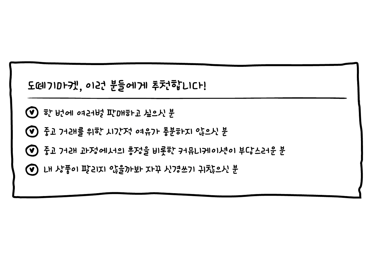 '3화 도떼기마켓은 '중개'하지 않는 이유'에서 말씀드렸듯 도떼기마켓은 개인간 거래에서 오는 다양한 문제들을 해결하고, 중고거래의 수고로움을 대신하기 위해 시작된 서비스니까요.
