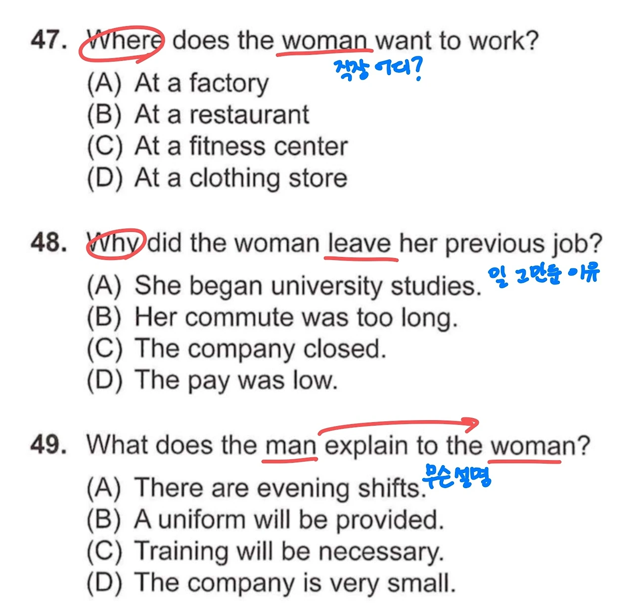 듣기 전에 문제와 보기를 다 읽어 두는 것이 중요하다. 나는 파트 시작 전과 문제를 풀고 남는 시간에 다음 문제의 핵심 단어에 표시를 하고 한국어로 약간의 메모를 했다. 글로는 설명이 어려워 사진을 첨부한다.