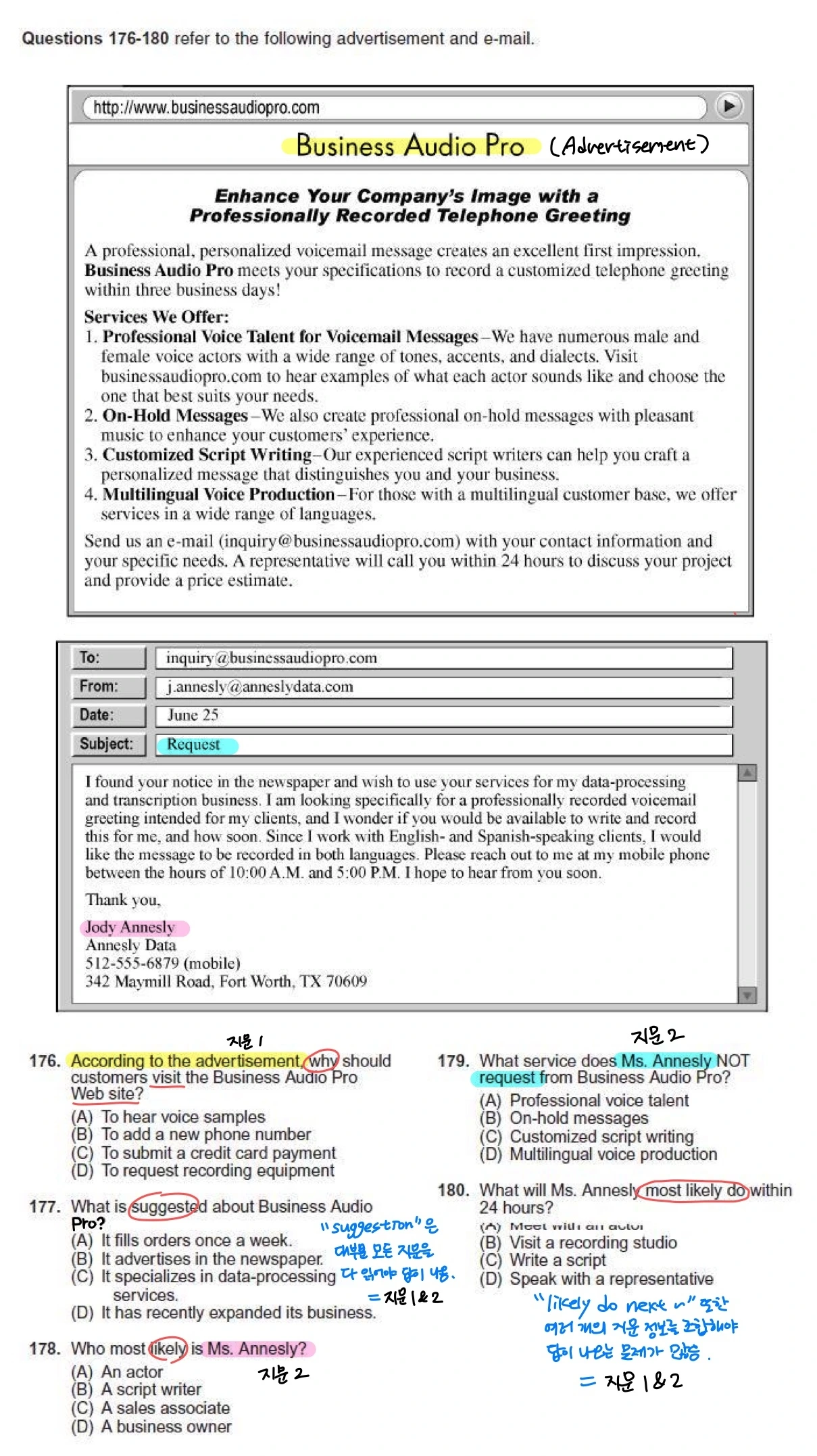 단일지문 25분, 이중지문 10분, 삼중지문 15분을 두고 풀었다. 이중, 삼중지문은 내가 가장 취약했던 파트여서 자주 틀렸고 어떻게 풀어야 할지 많이 고민했다. 파트7은 디테일이 핵심이다. 따라서 꼼꼼하게 지문을 읽을 수 있도록 1. 지문의 제목과 문제를 먼저 다 읽고, 2. 키포인트를 표시한 후 3. 각 문제에 해당하는 지문이 몇 번째 지문인지 표시한 후 염두에 두고 지문을 읽었다. 이해를 돕기 위해 사진을 첨부한다.