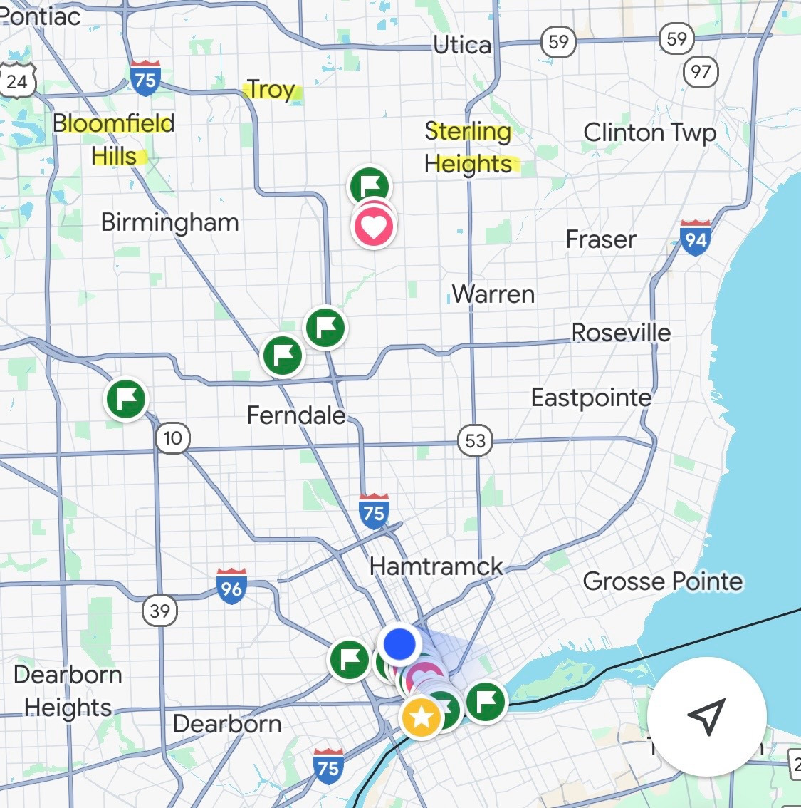 지금 내 위치로 표시된 곳이 디트로이트 중심부-다운타운이고, 그 위쪽 동네가 소위 White-ish 한 동네. 트로이, 스털링 하이츠 등. 여긴 한인도 꽤 있다.