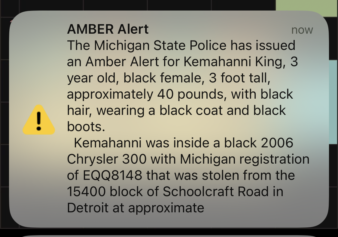 또 다른 일로는 새벽 한밤중에 아동 실종 신고 알람이 울린 적이 있는데, 3살 배기 흑인 여자 아이가 도난 차량에 납치되어 있다는 무시무시한 알람이었다.