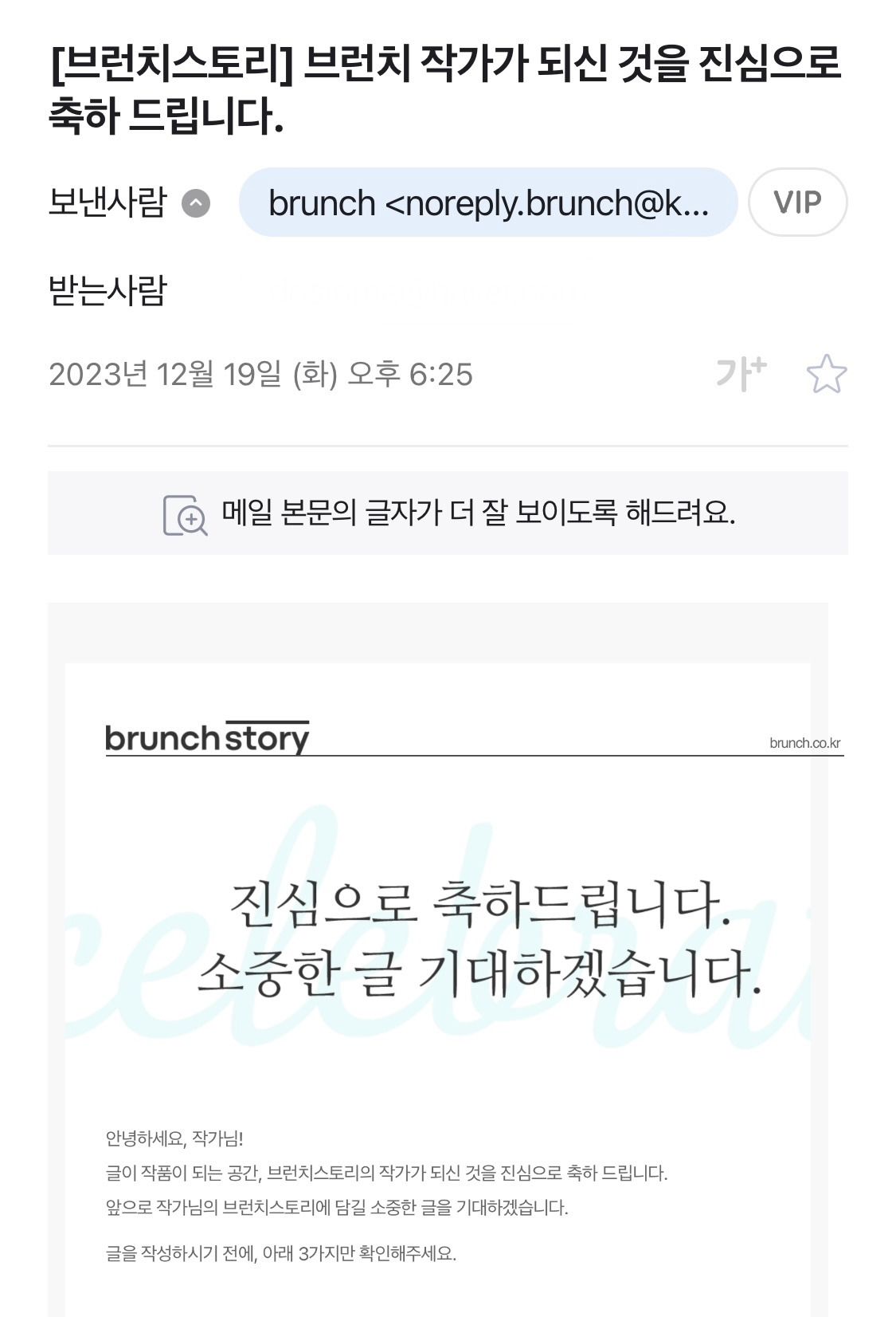 일주일 전, 갑작스레 브런치 작가에 도전하고픈 마음이 들어 무엇을 쓸지 고민을 하다 며칠 뒤인 18일 월요일 새벽에 충동적으로 후다닥 글을 써서 냈다. 하루 뒤인 19일 화요일 저녁 7시쯤 합격 메일을 받았다. 한 번에 합격이라니! 감사해요 브런치팀!