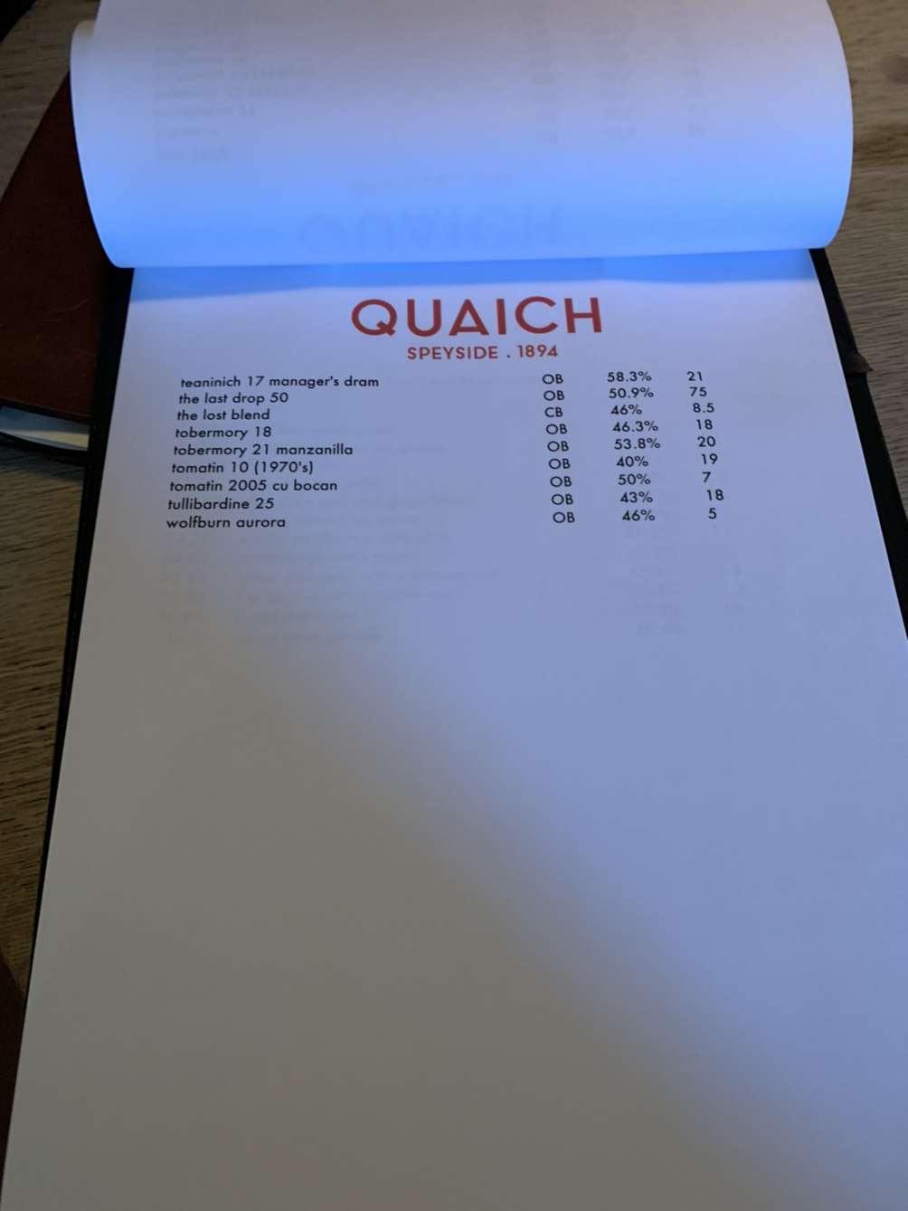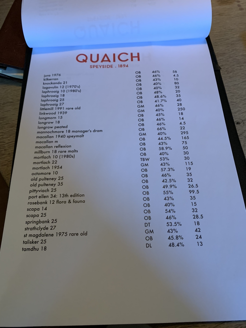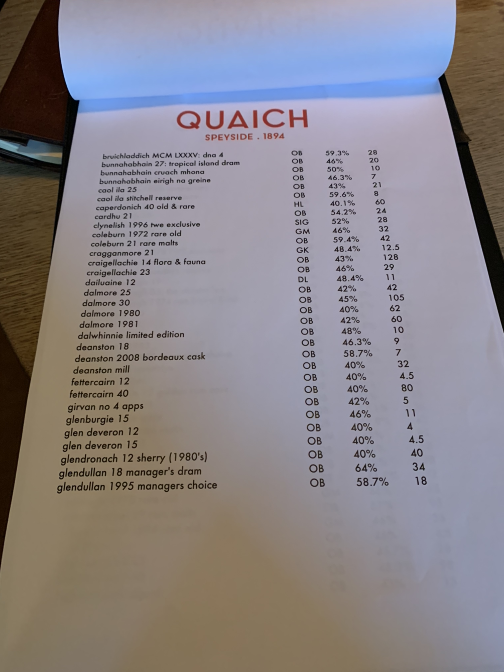 크라이겔라키 호텔(Craigellachie Hotel) 안에 있던, 레스토랑과 바이다. 음식,주류,장소를 공유하고 있어서 원하는 자리에 앉아서 두 식당의 메뉴를 이용할 수 있다. 스코틀랜드 음식을 그래도 외국인의 입맛에 맞춘 편이라 맛있게 여러 메뉴를 시켜서 먹었고, 몇가지 특이한 맥주와 꽤 많은 종류의 다양한 위스키(로컬 증류소 포함)를 합리적인 가격에 마셔볼 수 있었다. 특히, Balvenie tun 1509(batch 4) 와 Spey Valley 맥주, 그리고 손바닥만한 생굴이 으뜸이었다.