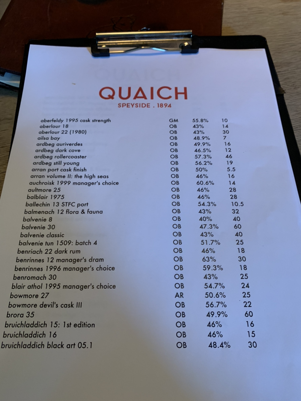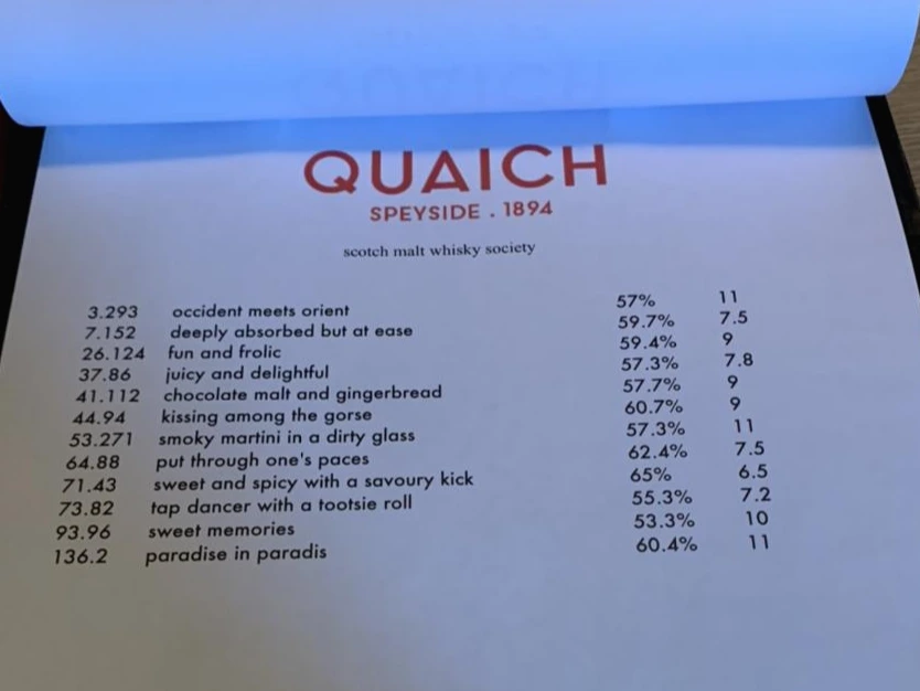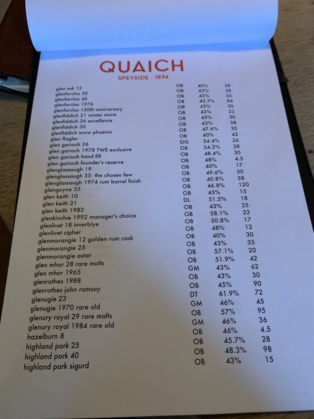 크라이겔라키 호텔(Craigellachie Hotel) 안에 있던, 레스토랑과 바이다. 음식,주류,장소를 공유하고 있어서 원하는 자리에 앉아서 두 식당의 메뉴를 이용할 수 있다. 스코틀랜드 음식을 그래도 외국인의 입맛에 맞춘 편이라 맛있게 여러 메뉴를 시켜서 먹었고, 몇가지 특이한 맥주와 꽤 많은 종류의 다양한 위스키(로컬 증류소 포함)를 합리적인 가격에 마셔볼 수 있었다. 특히, Balvenie tun 1509(batch 4) 와 Spey Valley 맥주, 그리고 손바닥만한 생굴이 으뜸이었다.