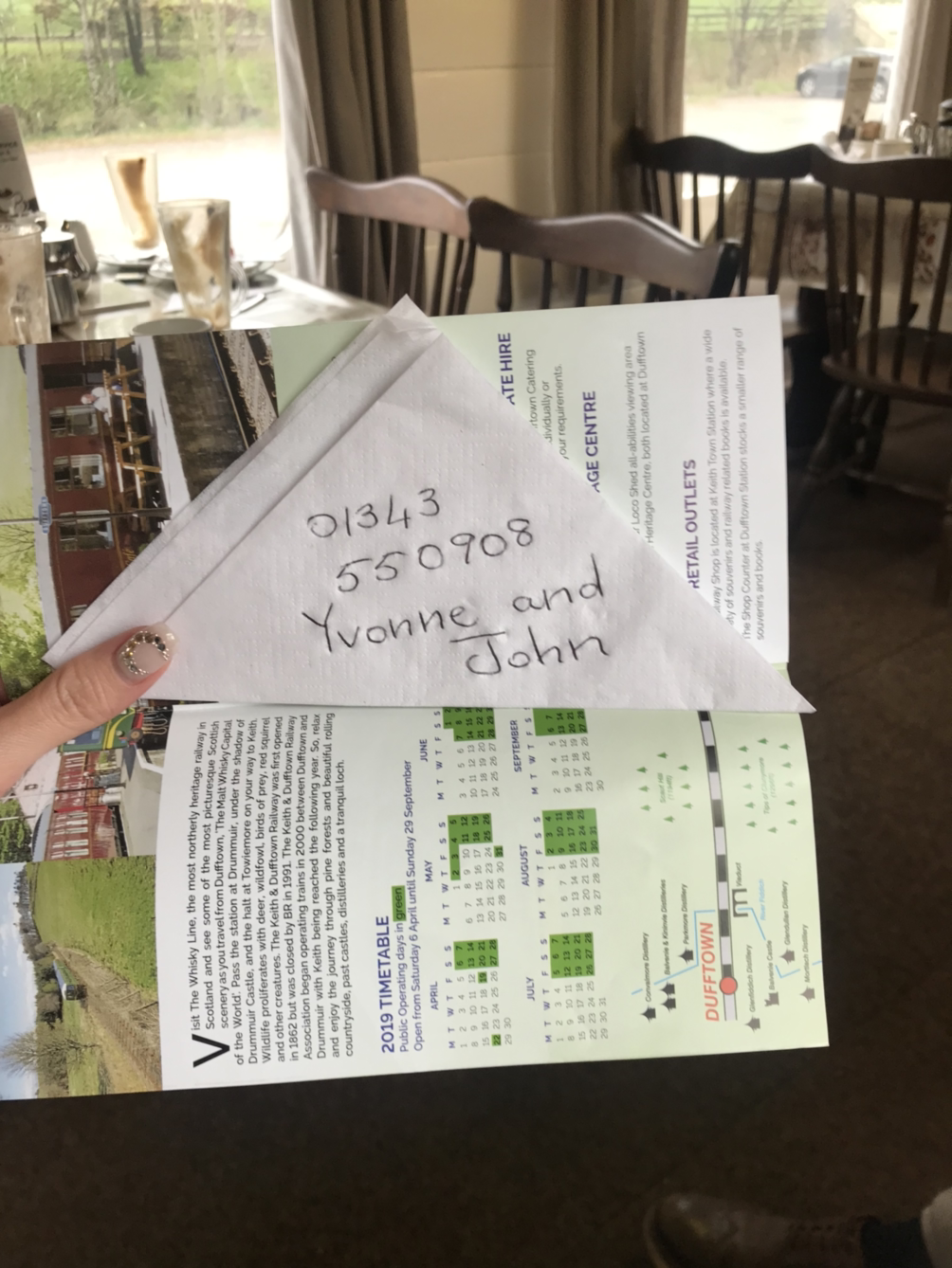 발베니 증류소를 나와서, 독특한 로컬 레스토랑에서 점심을 간단히 먹었다. KEITH라는 지역과 DUFFTOWN을 이어주는 기차가 예전에는 다녔었는데, 현재는 더 이상 운영을 하지 않는 모양인지, 레스토랑으로 개조한 기차 칸과 오래된 철길로 남겨져 있었다. 꽤 많은 동네 사람들이 기차 안의 모습을 그대로 남겨둔 레스토랑 안에서 식사를 하고 있었다. 동양인, 더더욱이 한국인은 보기 힘든 이 지역에서, 로컬 분들은 눈이 마주치면 말을 걸어왔다. 친절하게 스코틀랜드 날씨에 대해서 이야기하고, (우리가 있는 기간 중에는 파란 하늘이 자주 보였는데, 스코틀랜드에서는 자주 있는 일이 아니라서 그런지 날씨 이야기를 엄청 많이 했다.) 우리의 여행 이야기를 듣거나, 본인 동네에 오면 연락하라고 연락처까지 냅킨에 적어주시는 분도 있었다.