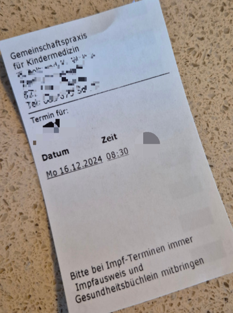 진료 예약부터 난관이긴 하나, 나는 독일어로 전화 예약할 자신도 없을뿐더러 동네 아이들 수에 비해 턱없이 부족한 소아과 때문에 보통 전화연결이 잘 되지도 않는다. 그래서 항상 예약을 위해 직접 방문한다. 금요일 문 열자마자 찾아가 예약을 했으나, 주말을 지나 월요일에나 진료가 가능하다고 하였다. 이 마저도 안 해주려는 분위기에 빨리 예약을 잡았다.