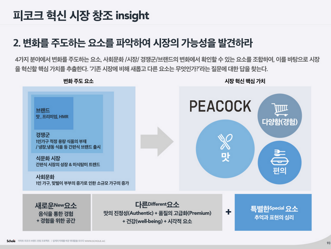 피코크는 인구 연령 변화라는 크로노스적 Time, 새로운 라이프 스타일의 출현이라는 카이로스적 Trend 그리고 피코크가 이 시대에 필요한 최적의 Timing을 간파해서 시장에 런칭했다. 그리고 고객의 욕구를 충족시키는 안위의 시간인 Peacock 시간(혼밥 시간)을 만족시켜 브랜딩 타임을 이루어 냈다.