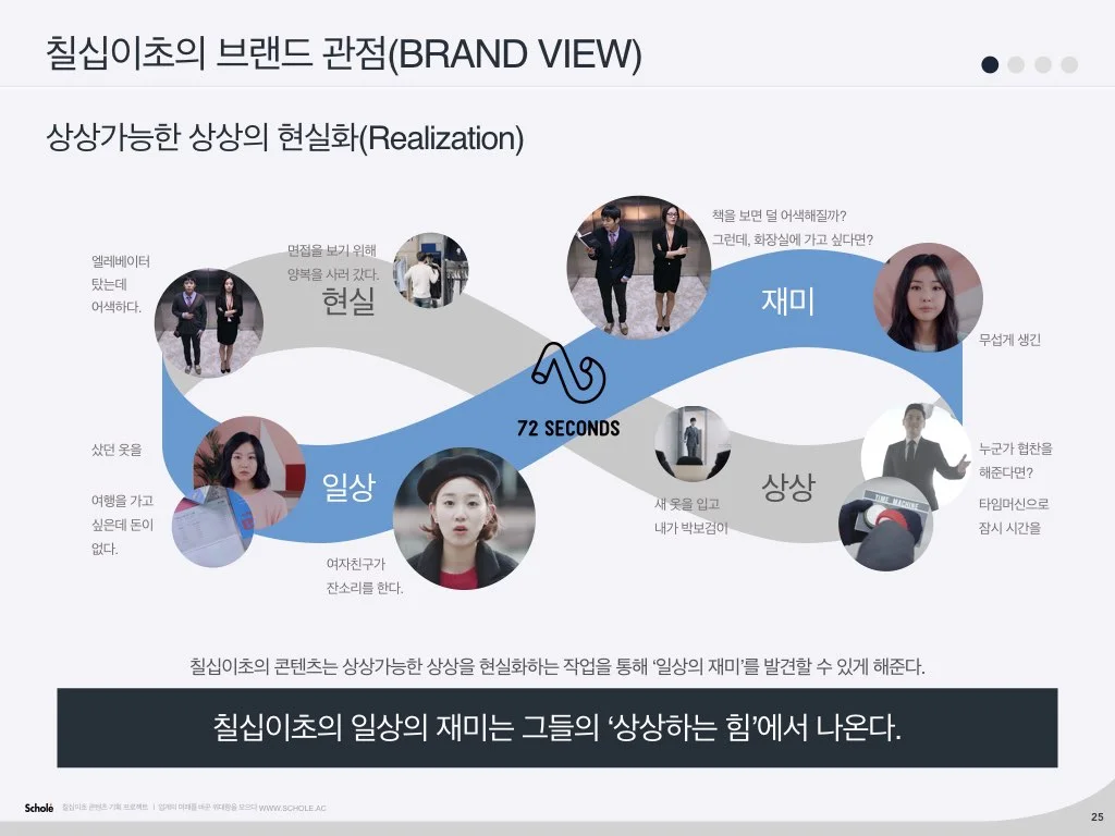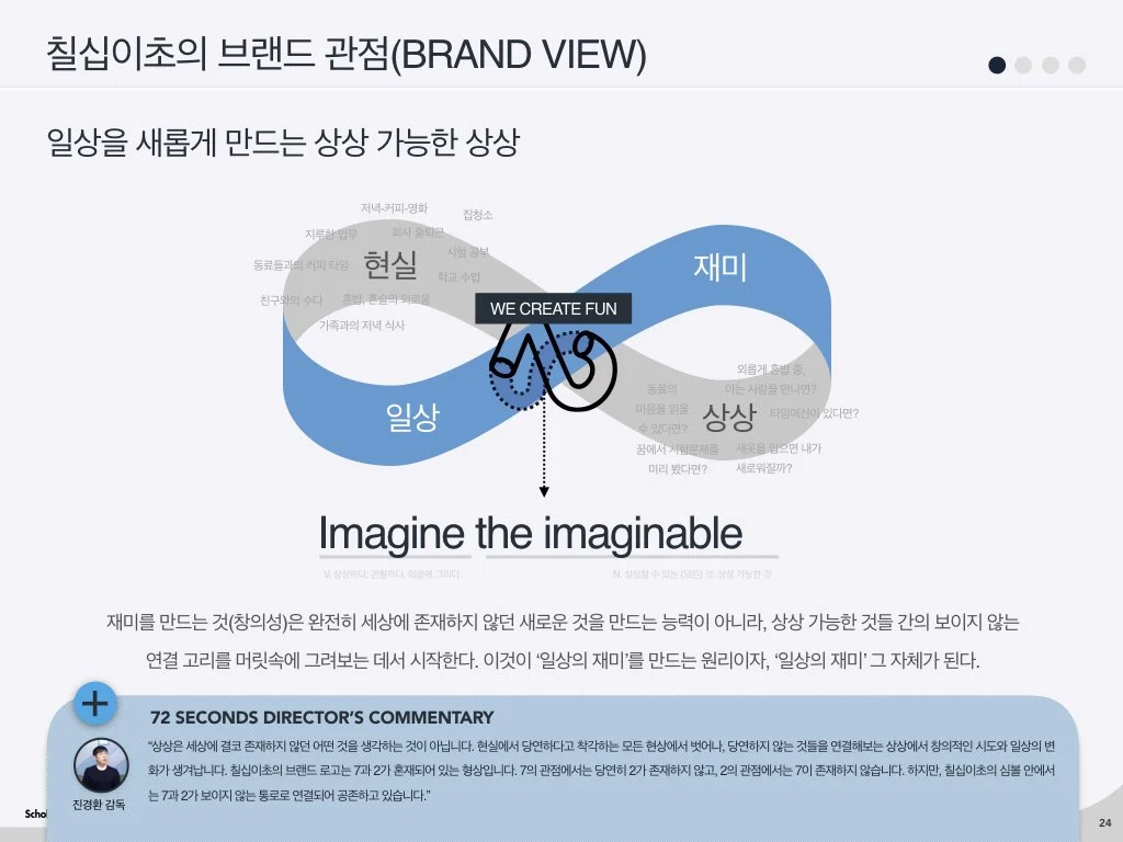 72초는 우리에게 언제나 지루한 일상을 재미있게 볼 수도 있는 상대성 [relativity, 相對性] 상상력을 소개하고 있다. 그것이 Imagine the imaginable(상상할 수 있는 것을 상상하라)이다.