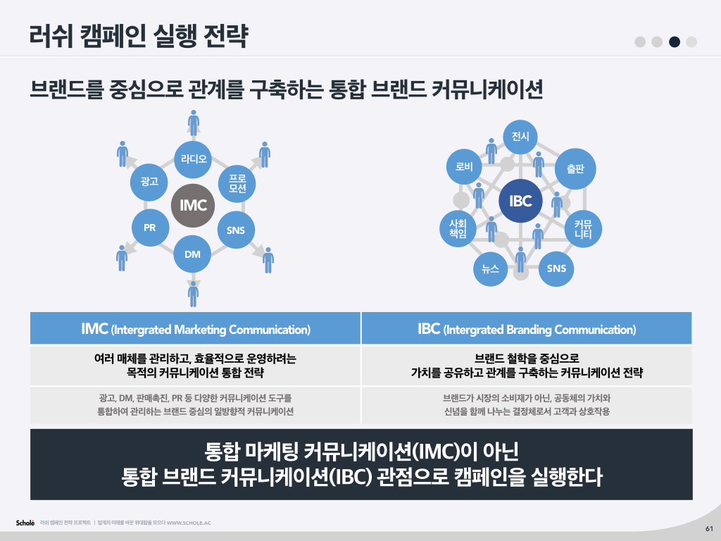 브랜드 모델을 설정할 때 가장 중요한 것은 ‘관점’과 ‘기준’이다. 가령, 스마트폰의 경우 서로 통화하게 한다는 점에서 같은 모델에서 나온 거라고 생각하기 쉽다. 하지만 애플 운영 시스템과 안드로이드 운영 시스템으로 인해 전혀 다른 스마트 폰이라고 느끼는 사람도 있다. 바로 이것이 '관점', '기준' 그리고 ‘경험’의 차이다. 러쉬는 세상을 바라보는 관점만으로 브랜드를 브랜드답게, 러쉬를 러쉽답게 만들었다.