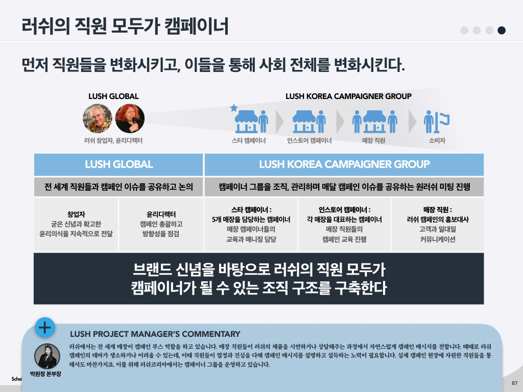 박원정 본부장; 진정성 있는 동참, 아무도 관심 갖지 않는 영역이라도 앞장설 수 있는 용기, 긍정적인 변화를 이끌어 낼 수 있는 현실적인 목표, 러쉬는 스폰서나 서포터가 아닌 캠페인 파트너라는 오너십입니다.