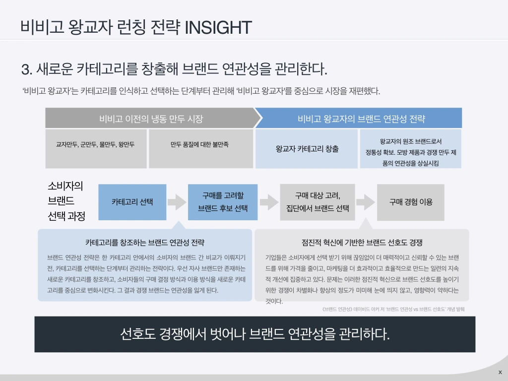 비비고 브랜드의 혁신 린치핀 제품 왕교자는 교자 만두시장에서 혁신을 통해 경쟁자의 ‘연관성’을 제거함으로써 히트상품이 되었고 아사히는 혁신 린치핀 제품인 슈퍼드라이를 린치핀으로 기린의 연관성을 상실시켰으며, 나이키는 에어포스를 통해 경쟁자를 도태시켰다. 이 브랜드 모두 린치핀 제품을 통해 브랜딩의 효율성을 높였다. 애플 와치, 카카오 뱅크, 슬립 넘버스 등 혁신 린치핀 제품은 경쟁사의 연관성을 상실시켜 브랜드를 강화하는 계기를 만들게 된다.