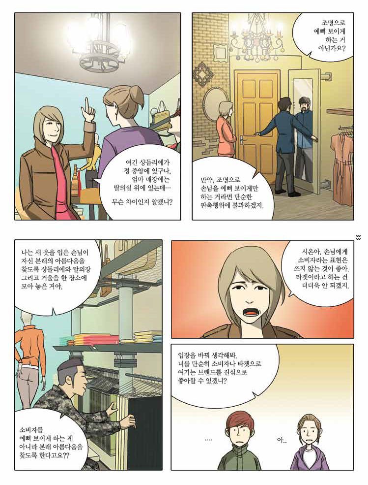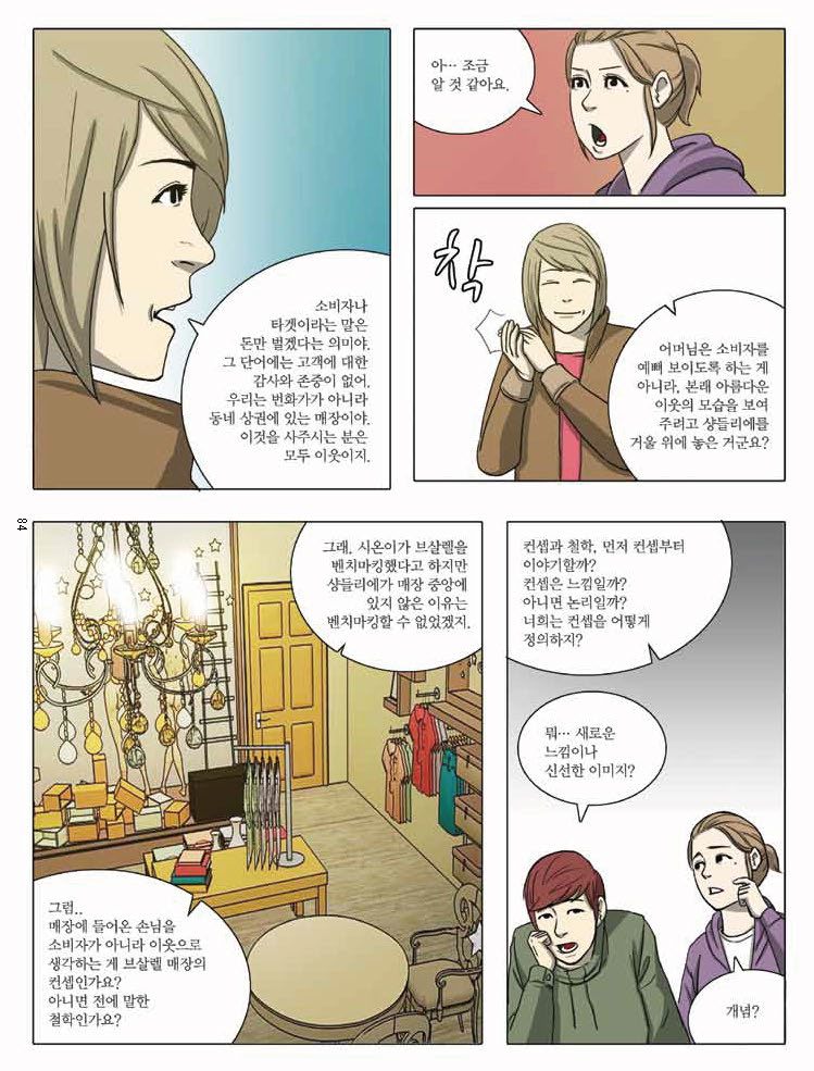 예를 들어 ‘싸고 품질도 좋고 누구나 입을 수 있는 세련된 옷’이라고 말한다면 어떤 브랜드가 떠오르는가? 과연 가격이 저렴하면서 품질이 좋을 수 있을까? 그리고 모든 연령대가 입는 세련된 옷이 존재할까? 이런 ‘압축된 논리’가 시장과 경영에서 ‘콘셉트’이라는 이름으로 사용된다. 결코 하나가 될 수 없을 것 같은 ‘지성과 감성’이 하나가 되어 만들어진다. 그래서 전문가들은 콘셉트를 이해하지 않고 대부분 ‘느낀다’고 말한다. 물론 소비자들도 콘셉트를 한 줄 혹은 한 단어로 인식하지 않고 ‘전체’로 느낀다. 그것을 ‘글’로 정의하는 것에 한계가 있음은 콘셉트를 다루는 사람이라면 모두 아는 이야기다.
