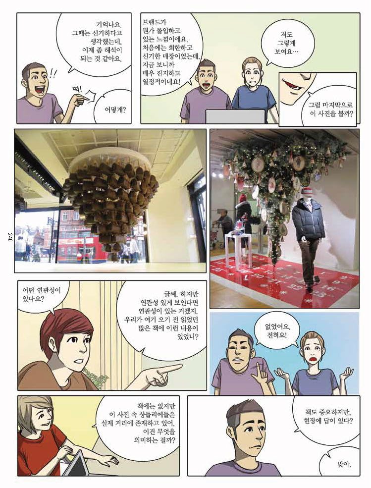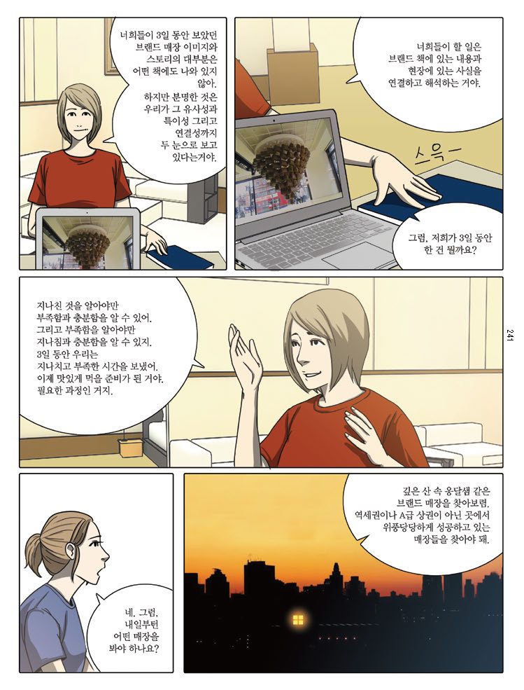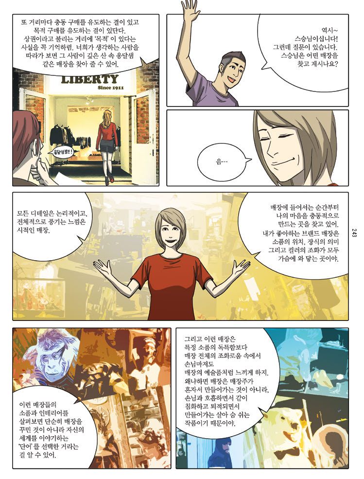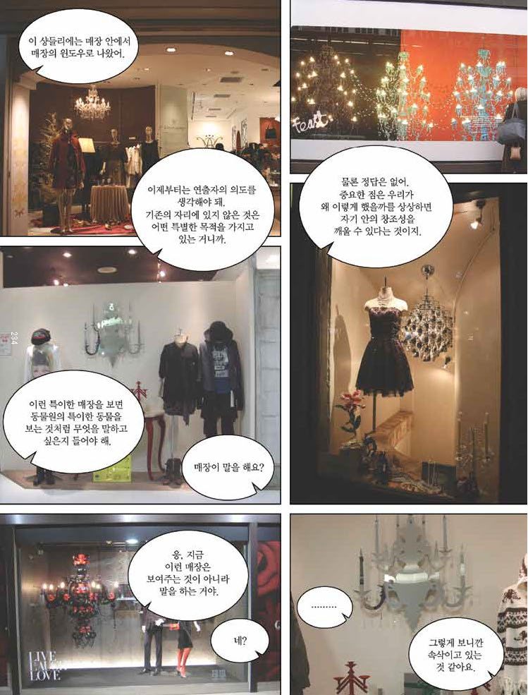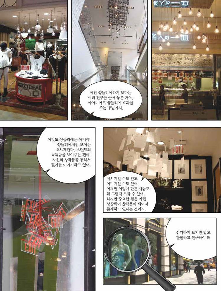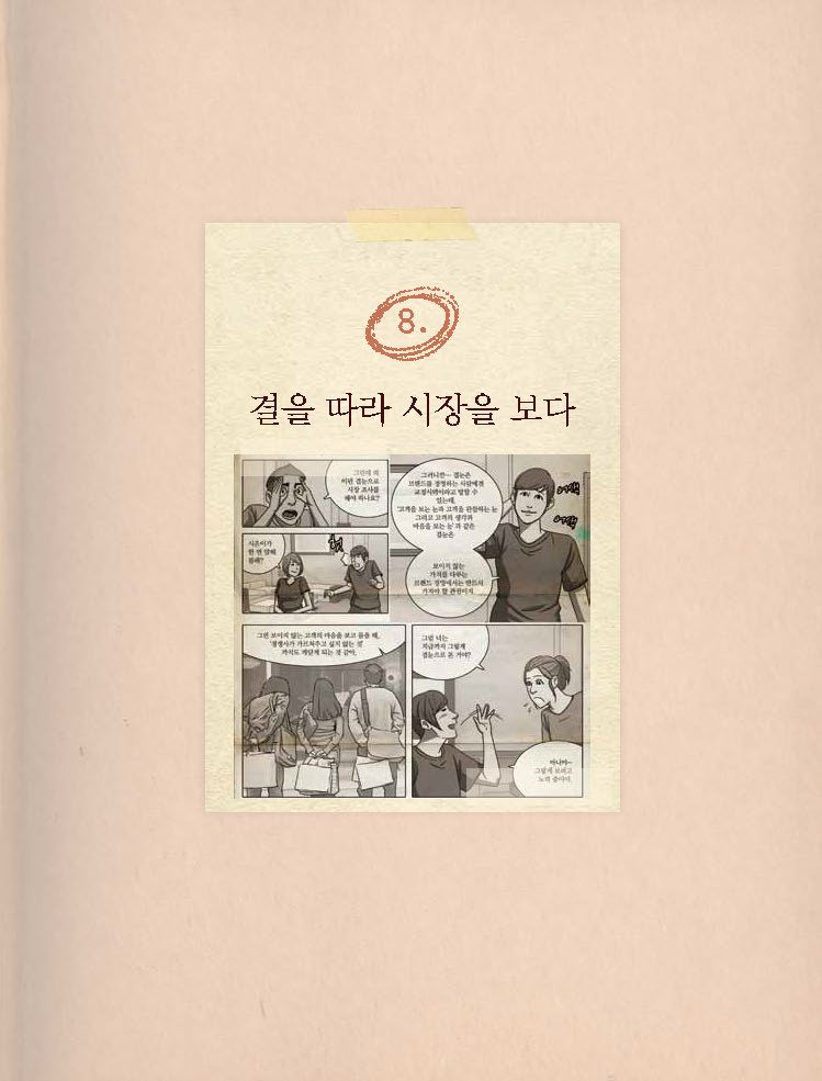 거리도 단순 보행자들에게는 거리이지만 시장 조사자들에게는 ‘어장’이다. 어떤 거리는 지나가는 사람 반, 그리고 트렌드 반이다. 어떤 거리는 미래, 현재, 그리고 과거가 엉켜 있기도 하다. 또 어떤 거리는 모방과 창조가 어우러진 혁신의 거리다. 또 어떤 사람에게 거리는 브랜드 참고서다. 간혹 트렌드(한 브랜드의 신상품만을 사는) 및 브랜드 리더를 보는 것은 책의 각주를 보는 것과 같다. 거리는 계절, 요일, 시간, 이벤트별로 사람들이 달라지는 곳으로써, 거리를 보는 사람은 거리의 난류와 한류가 만나는 교차점에 서 있는 것이다.