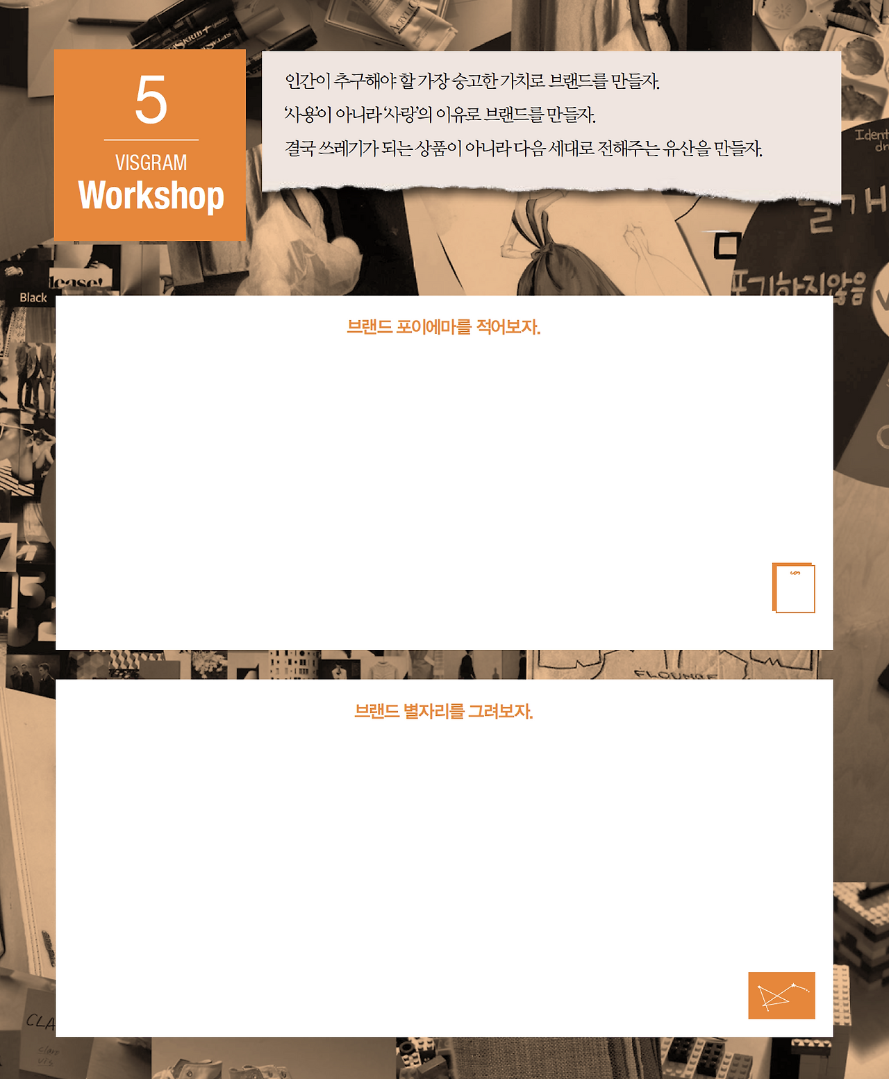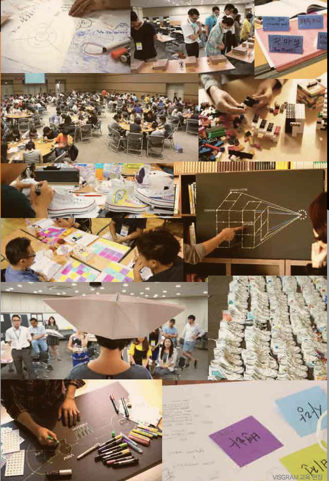 오늘은 한승희와 함께하는 브랜드 구축 교육의 마지막 날이다. 지난 수업에 시온이 발표했던 비스그램 브랜드 휠을 생각해본 다음, 각자 생각하는 비스그램을 그 전처럼 블록, 별자리, 포이에마, 신발 등으로 구현해서 공유하는 시간을 갖기로 했다. ‘비스그램’이라는 단어를 통해 서로의 감정을 공유하기 위해서였다. 모두의 가치가 통합되어 비스그램이 탄생했지만 브랜드 휠을 시온이 완성한 만큼, 한승희는 ‘비스그램’이라는 브랜드를 모든 팀원이 깊이 느끼고 공통적인 체험으로 공유하기를 원했다. 공통적인 체험은 브랜드를 만드는 사람에게 믿음, 신념, 동질감을 주고 비전을 공유하게 만들어 주기 때문이다.