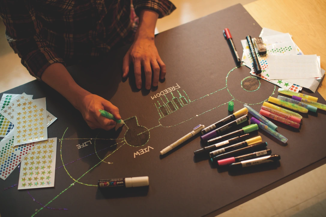 “나도 너희가 포이에마와 블록을 보면서 여러 영감이 떠올랐는데 그중 하나가 바로 깨어진 접시야. 난 블랙과 화이트 콘셉트 사이에 있는 컬러를 깨어진 가치라고 생각했어. 유진이와 상철이의 아이디어가 좀 혼합되었지만 나만의 융합! 일단 깨진 부분을 비스그램이라는 접착제로 붙일 수 있다는 생각에 깨어진 접시 별자리를 그렸어.”