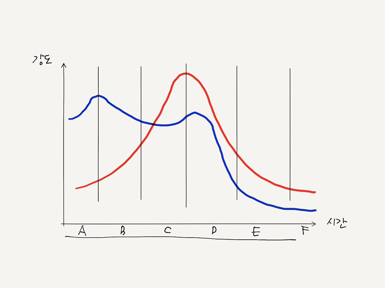 시장 리드 브랜드들의 성장 곡선은 아래 그림과 같은 것이 일반적인 유형이다. 산처럼 올라갔다가 산처럼 내려온다. 파란 선은 조직의 에너지이다. 붉은 선은 브랜드 매출이다. 브랜드 라이프 사이클을 파란 선으로 볼 것인가? 아니면 붉은 선으로 볼 것인가에 따라서 브랜드 미래는 다르게 펼쳐진다. 어떤 선을 주목하느냐, 인정하느냐, 측정하느냐, 우선순위로 둘 것인가에 따라서 리뉴얼 시점을 B로 할 것인가? D로 할 것인가? 가 결정된다. 브랜드 운명이 결정된다.