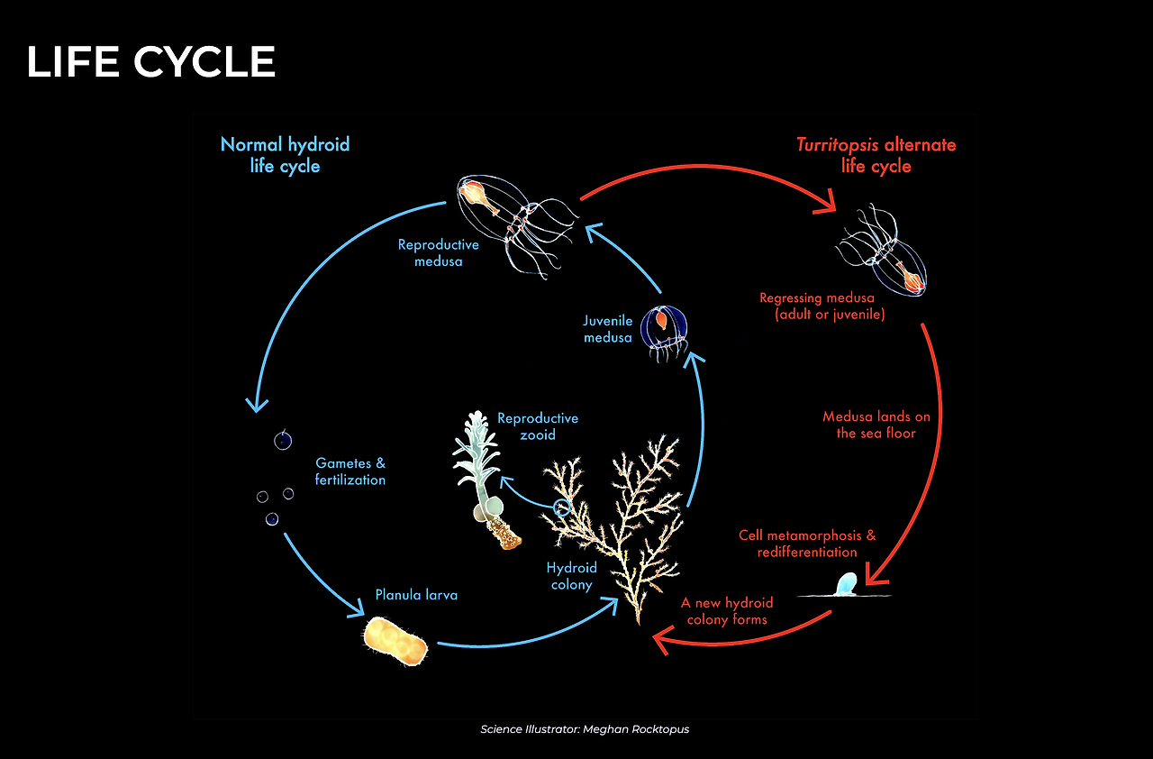 홍 해파리는 생물학적으로 해파리보다는 히드라(Hydra)와 가까운 특성을 지녔다. 하지만 일정 수준 이상 노화하지 않는 히드라와는 달리, 홍해파리는 노화하지 않을 뿐 아니라, 다시 어린 상태로 되돌아가 성장하는 특이한 생명 주기를 가지고 있어 진정한 ‘영생불사’의 동물로 평가받는다. 자연계에서 홍해파리의 이러한 영원한 생명 사이클은 매우 독특하다.