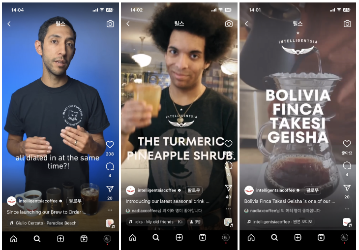 브랜드 소셜 미디어도 블로그를 닮았습니다. 영상으로 쉽게 따라 하는 시즌 음료 제조법, 바쁜 와중에도 맛을 유지하는 바리스타들의 비결 등 유용한 정보에 초점을 맞췄죠. 인텔리젠시아를 모르는 사람들도, 커피에 대한 유익한 이야기를 접하게 되니 덜 거부감을 느끼게 됩니다.