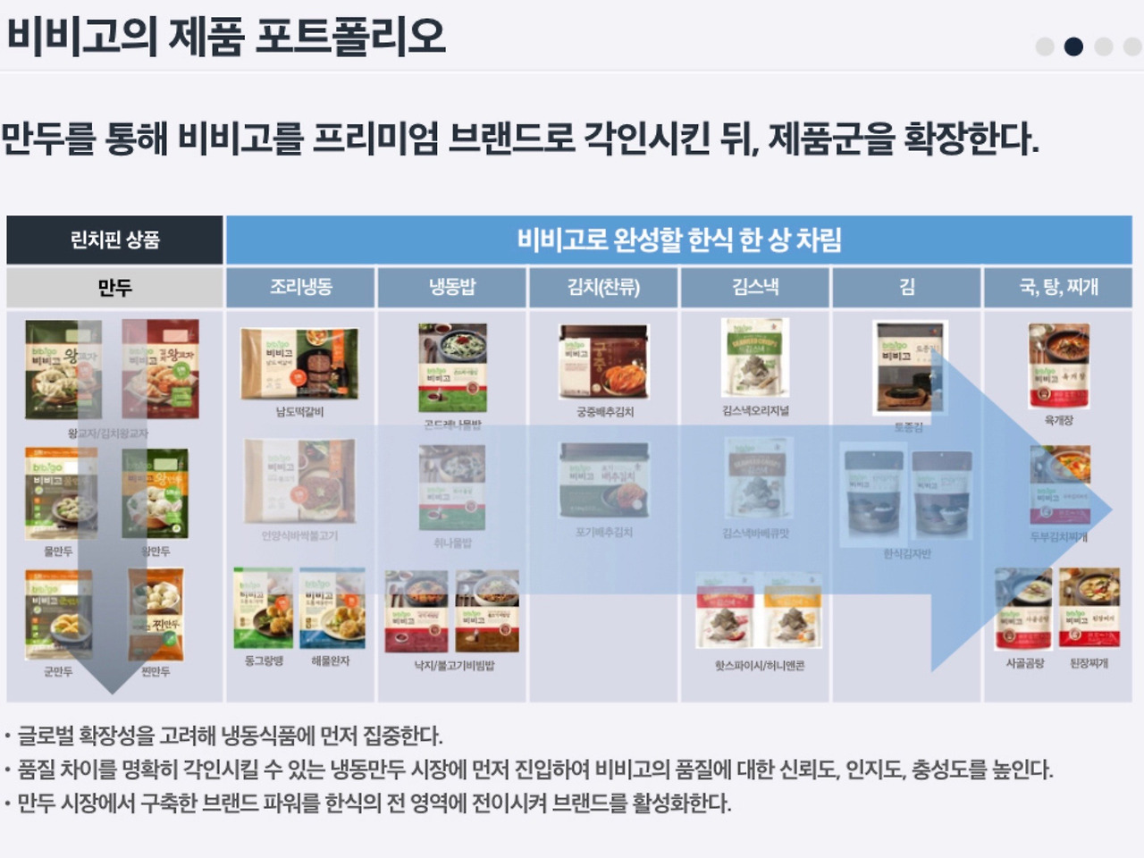 그렇다면, 비비고의 대표 상품이 왕교자로 마케팅을 해도 되는 걸까? 비비고는 만두만 전문으로 판매하는 곳이 하닌데? 라고 생각할 수도 있습니다. 이 부분은 우선, 왕교자로 비비고를 프리미엄 상품으로 각인시킨 뒤, 제품군을 확장하는 전략을 사용한다고 합니다. 아래 사진을 보면 바로 이해가 되실 겁니다.