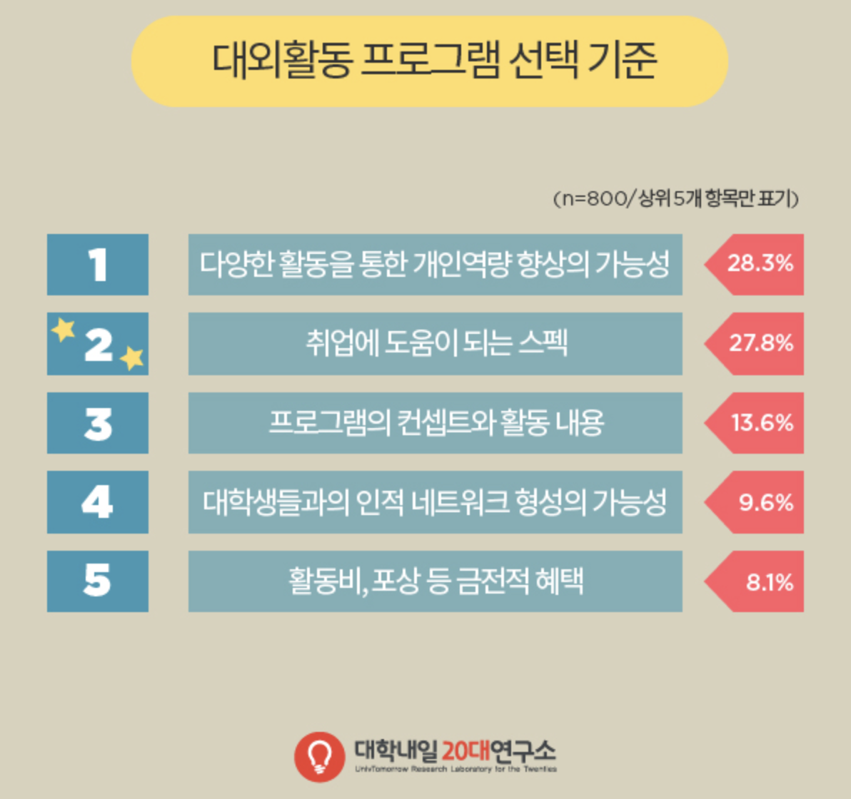 이미 중학생 때부터 취업을 걱정하고, 미래를 불안해하는 사회적 분위가 결국 20대 대학생 대외활동 시장에도 영향을 준 것은 아닐까요?