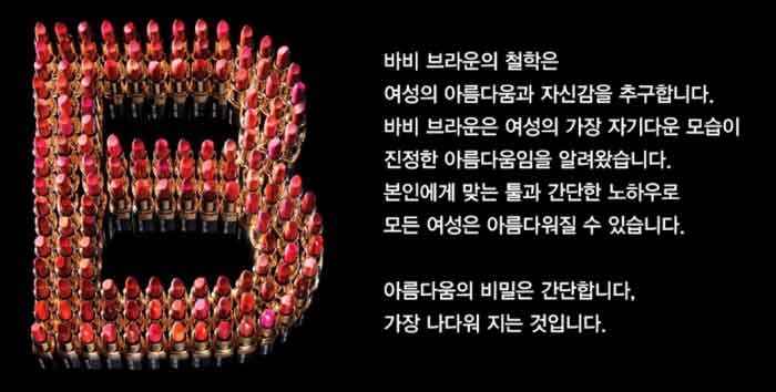 이후 그녀는 개인의 개성과 스타일을 최대한 살려주는 게 가장 아름답다는 사실을 알게 되었고, 인위적인 것을 하다 보니 오히려 자연스러운 것의 아름다움을 알게 되었다고 말합니다. 이러한 과정 속에서 바비 브라운 브랜드 철학이 자연스럽게 만들어지게 된 것입니다.