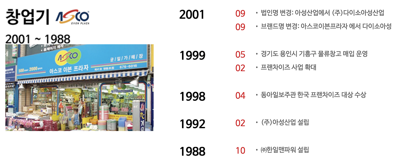 마지막으로, 가장 논란이 많을 브랜드인 다이소입니다. 1988년 (주)한일맨파워로 시작해 1992년 (주)아성산업을 설립 후 2001년 일본의 다이소산업에서(大創産業) 지분투자를 받으면서 '아성 다이소'로 변경하게 되었습니다.