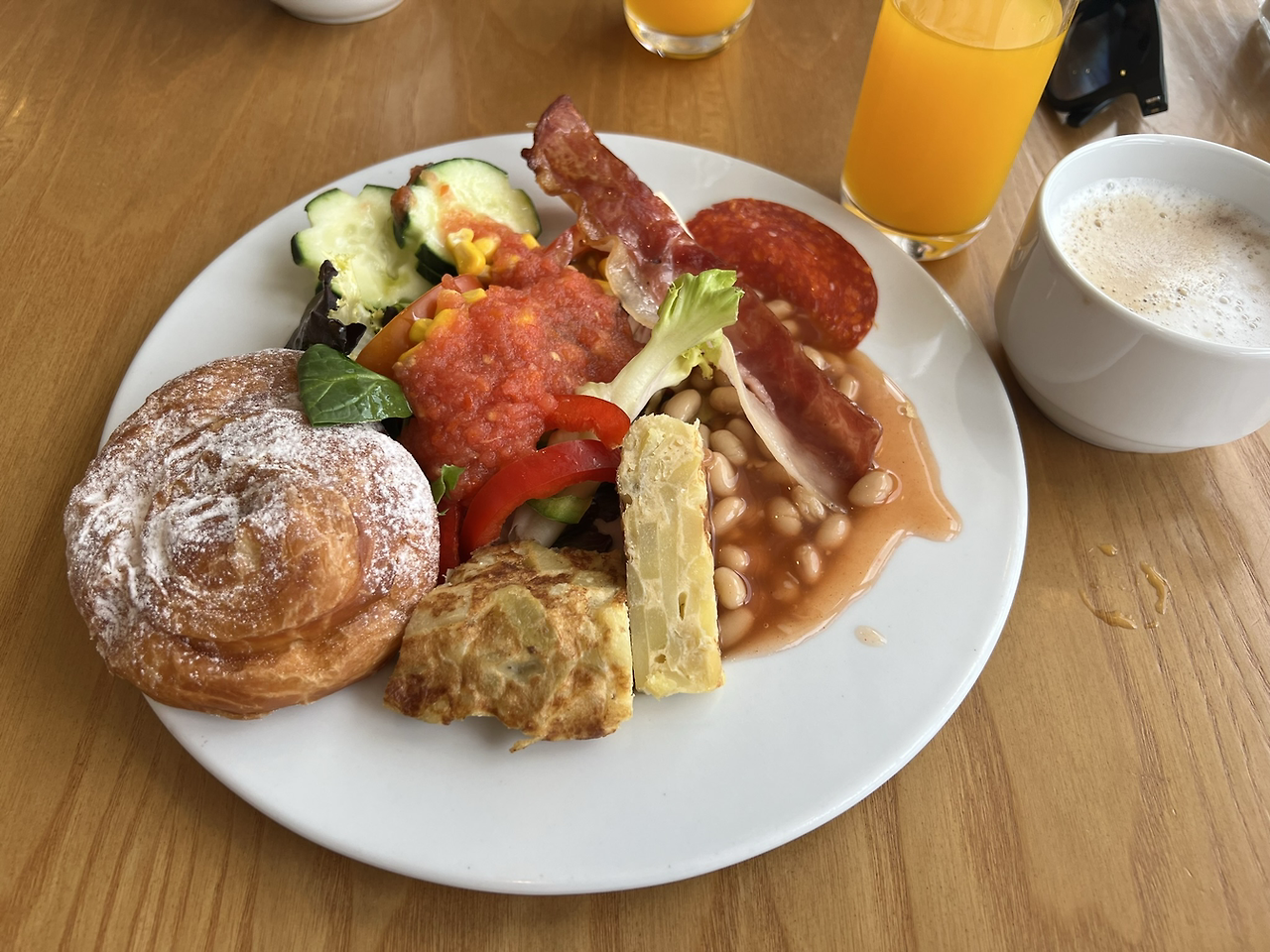 눈뜨자마자 얼굴만 씻고 모자를 눌러쓴 채 아침을 먹으러 갔다. 쓰리스타 호텔이라 별 기대를 안 했는데 아침식사가 은근히 실했다. 샐러드는 오이, 당근, 비트, 양상추, 올리브, 토마토, 옥수수 등등 기본적인 것만 준비되어 있었는데도 재료가 신선해서인지 아주 맛있었다. 빵, 베이컨, 콩, 커피 머신과 주스 머신 등 기본적인 차림이었지만 이상하게 오성급 호텔들 못지않은 맛이 났다.