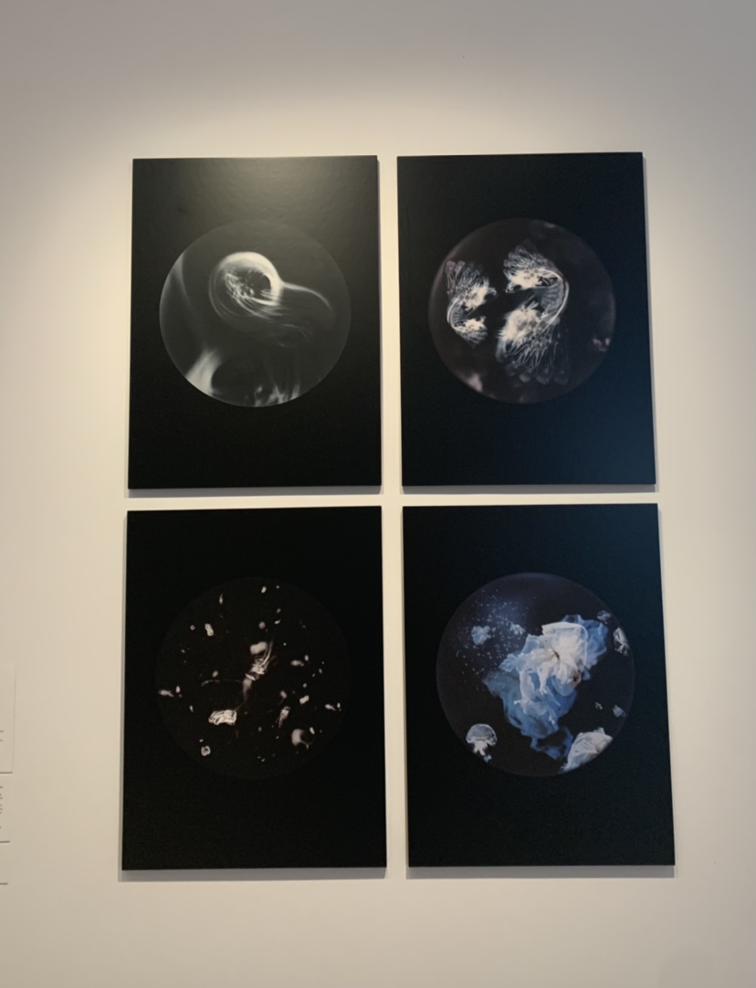 맨디 바커의 표류를 넘어서: 불완전하게 알려진 동물들. 현미경으로 찍은 사진 같지만 사실 오래 노출시켜 찍은 바다의 플라스틱 쓰레기들이라고 한다. 왼쪽부터 시계방향으로 유모차 바퀴, 세발자전거 바퀴, 전깃줄, 플라스틱 봉지다. 이런 미세 플라스틱 조각은 플랑크톤이 먹고 그 플랑크톤을 바다생물들이 먹음으로써 결국 우리가 섭취하게 된다고 한다. 알고 있었던 사실이라도 이렇게 시각적으로 보니 머리가 띵했다.