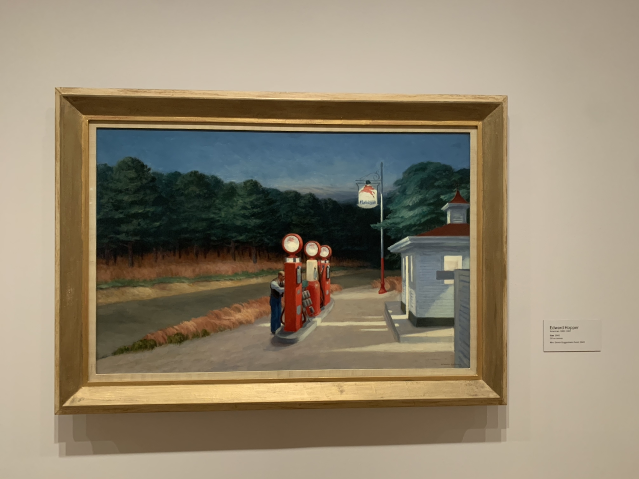 에드워드 호퍼의 가스. 에드워드 호퍼의 밤을 지새우는 사람들은 시카고 미술관에 있어서 자주 보다가 푹 빠지게 됐는데 이 작품은 처음 보는 거였다. 나는 그가 만들어내는 풍경의 색감이나 사연 있어 보이는 분위기가 좋다. 그는 이 작품으로 미국 시골길의 외로운 풍경이 주는 감상을 그려내고 싶었다고 한다.