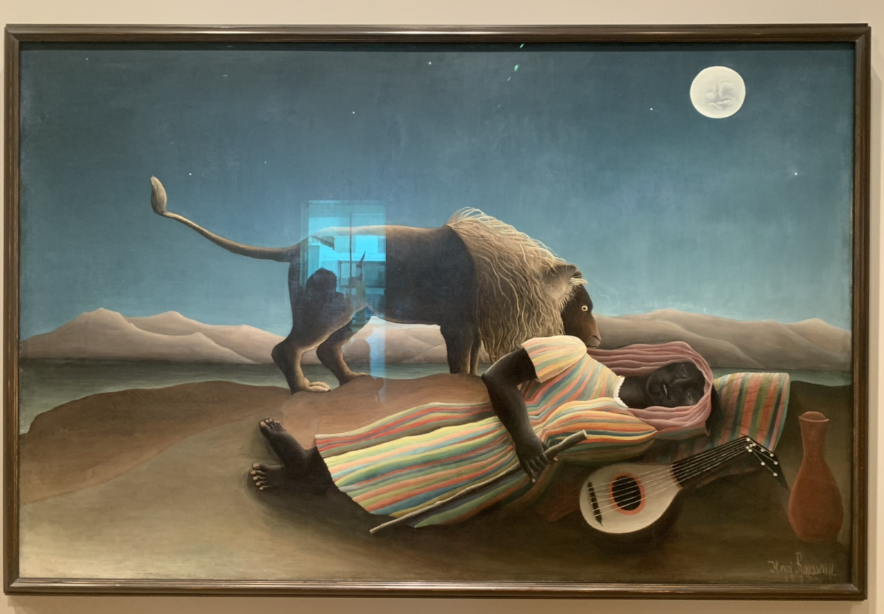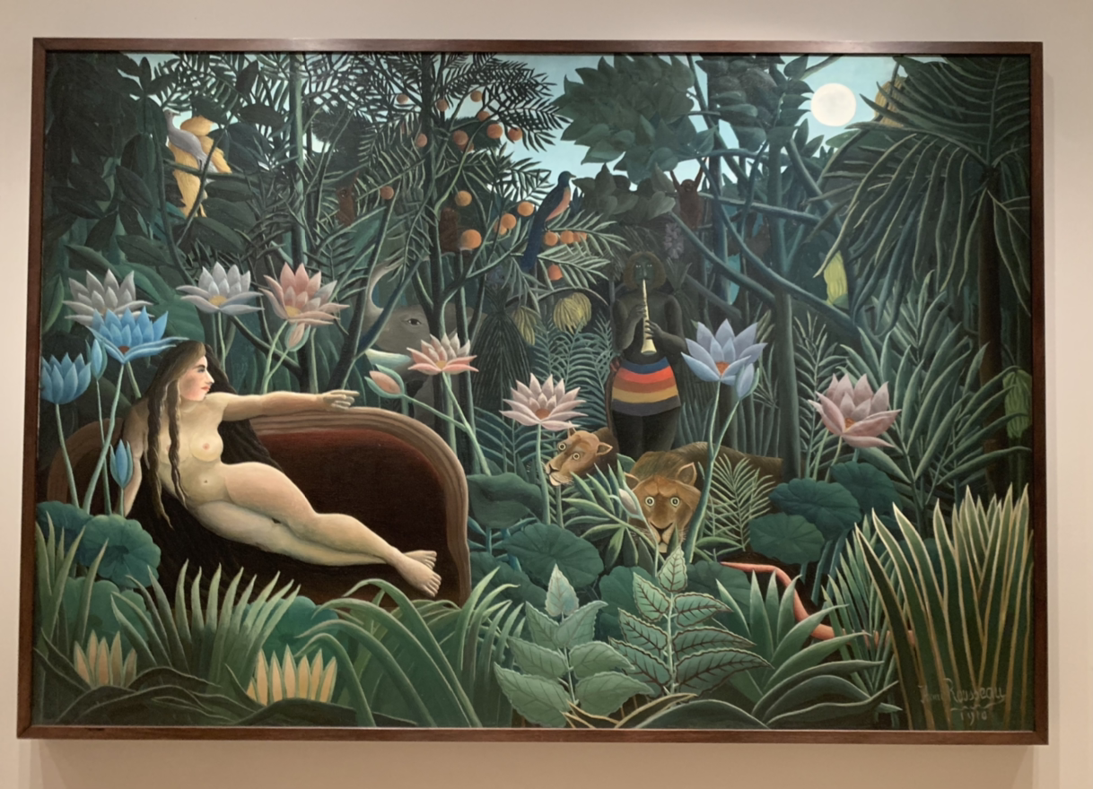 앙리 루소의 꿈이라는 작품이다. 처음에는 작품의 크기가 시선을 끌고 그 다음엔 다양한 색채와 이국적인 풍경이 눈에 들어온다. 살바도르 달리와 르네 마그리트에 영향을 줬다는 앙리 루소는 종종 꿈에서 본 풍경에서 영감을 받고 그림을 그렸다. 이 그림은 파리 식물원에 다녀와서 받은 영감을 바탕으로 그렸다고 한다.