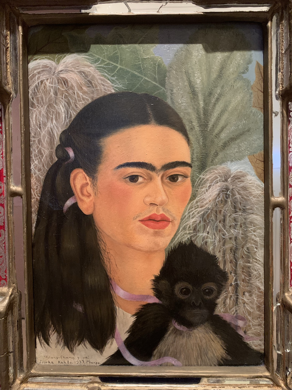 프리다 칼로의 풀랑 창과 나라는 작품이다. 프리다보다 훨씬 작게 그려졌음에도 원숭이의 존재가 시선을 강탈한다. 원숭이는 프리다가 디에고 리베라와 가지려 해도 가질 수 없었던 아이들을 뜻한다고 한다. 그걸 알고 보니 원숭이와 프리다를 연결해주는 분홍 리본이 보인다.
