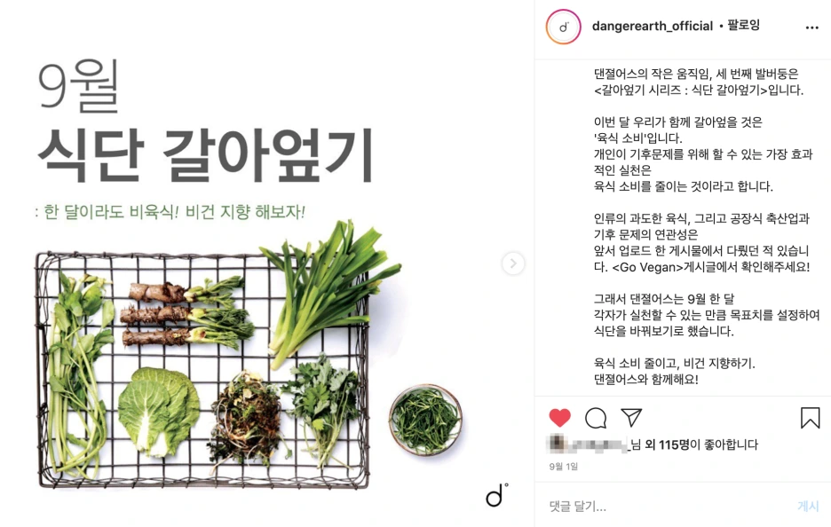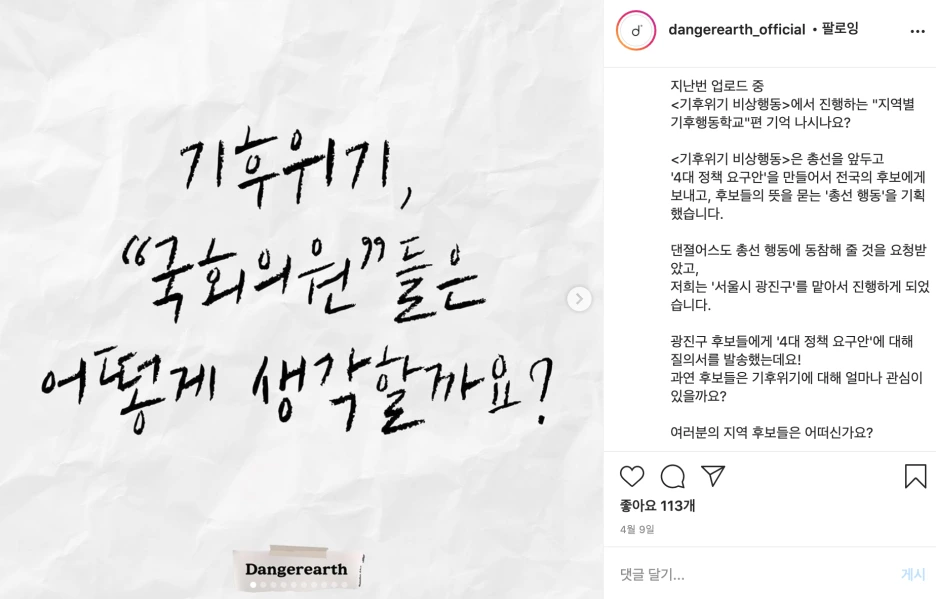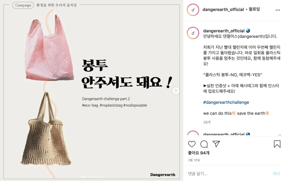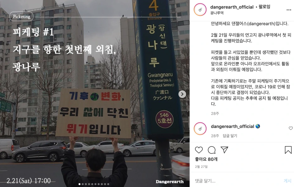 댄졀어스 인스타그램을 봤어요, 개인적 차원의 실천도 하시지만, 거리로 나가 피케팅도 하시더라고요!