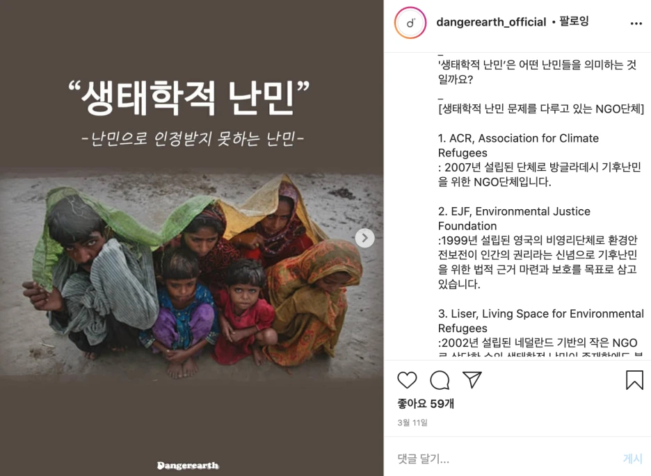 기후 시스템 자체가 변하게 되면, 생각지 못한 기후난민 문제도 생겨나요. 우리 아시아 쪽은 농업이 주 산업이어서 기후 문제는 곧 식량문제로 연결되어요. 식량을 구하지 못해서 어려움을 겪게 되는, 즉 기후 난민이 될 거예요. 우리나라도 곡식이 내수보다 해외에 많이 의존하는 편이에요. 그래서 이 문제도 이웃나라 사정이 아닌, 우리가 마주할 큰 문제라고 생각해요.
