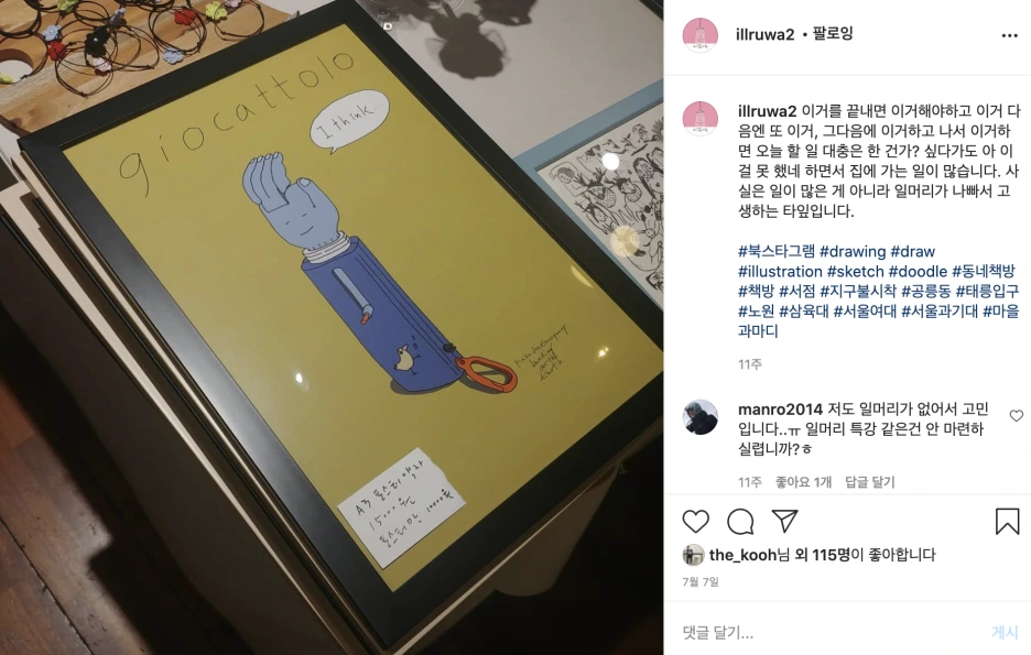 원래는 무역 일을 했는데, “나는 왜 이렇게 나에게 어울리지 않는 일을 할까?” 고민이 많았어요. 그러다 회사가 망했어요. 더 이상 할 게 없는 시간이 길어지면서 그림 그리는 시간이 많아졌어요. 그 많아진 시간 동안 그림책도 그리게 되고 전시도 하게 되고 책도 만들게 되고 책방도 알게 되었고. 이렇게 책방도 하게 되었네요.