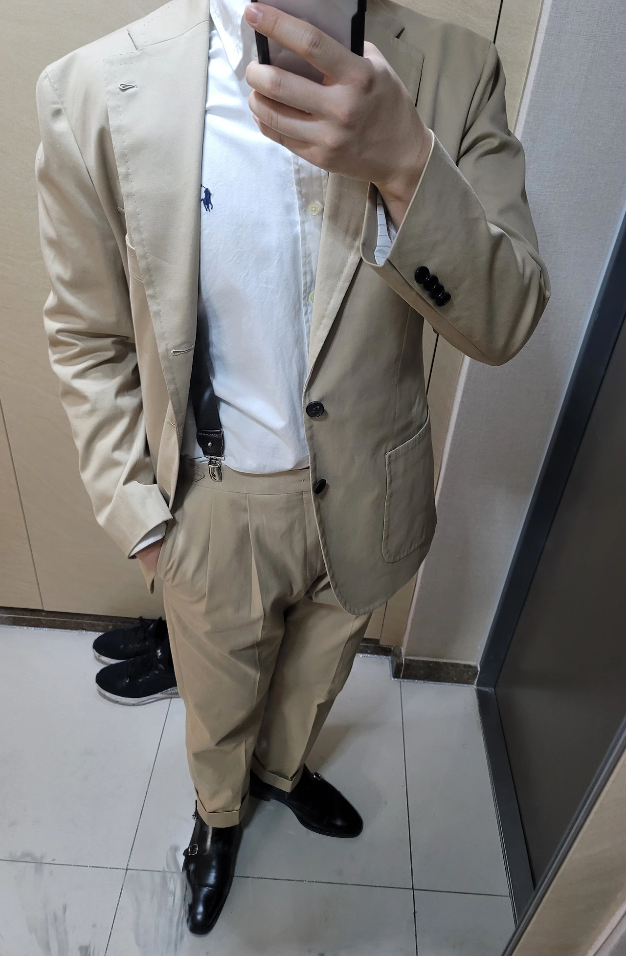 수선까지 마친 어두운 베이지색 코튼수트. 나머지 코디는 버튼다운 옥스퍼드 셔츠-갈색 서스펜더-더블 몽크 구두.