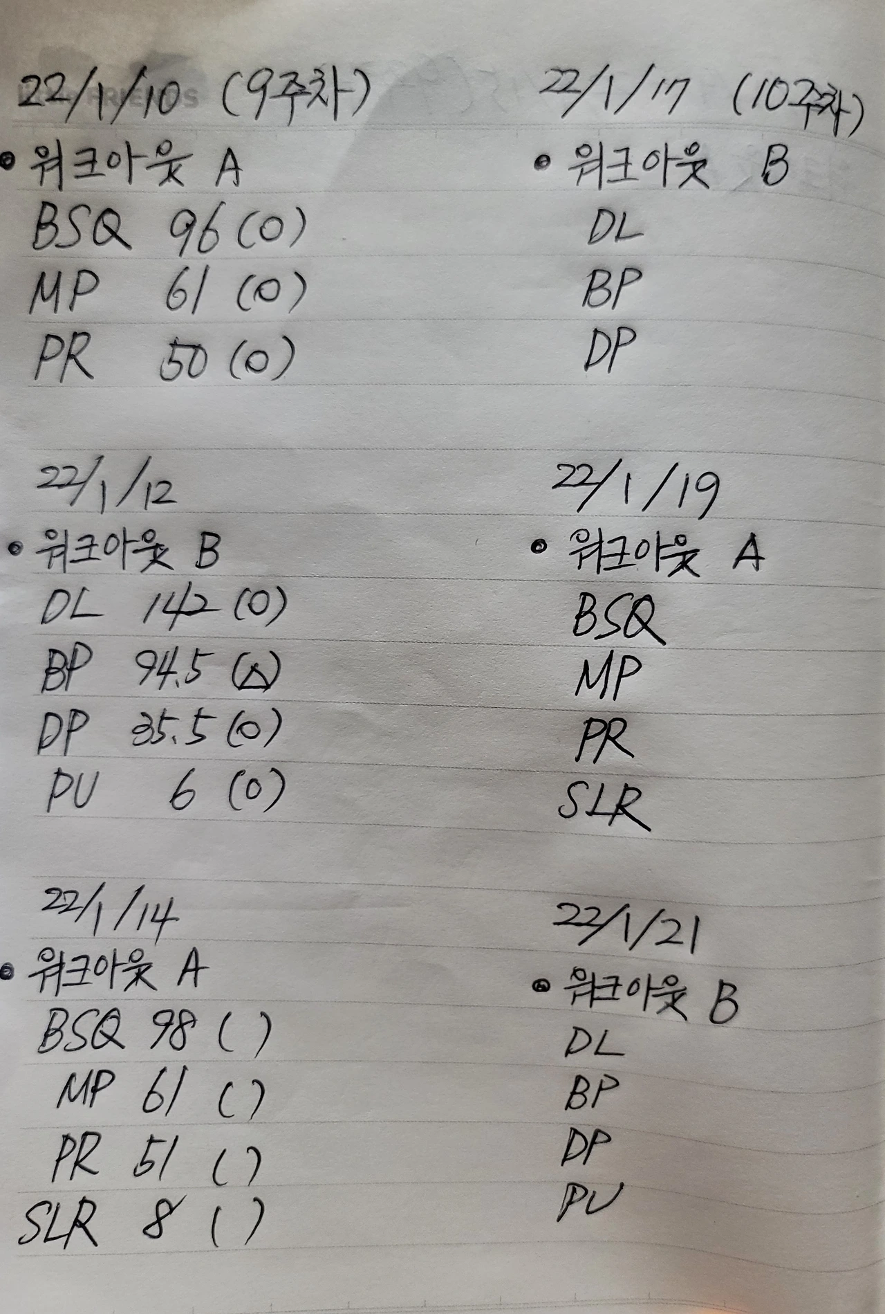 스트렝스 훈련에 관한 기록을 남기고 있다. 시작은 지극히 즉흥적이었다. 주마다 세 번씩 실시하는 몇 가지 운동의 세트별 무게를 기억에만 의존하려니 영 부정확하고 불편해서였다. 들고 있던 걸 잠깐 내리고 고개를 돌리니 책꽂이 구석에 작은 수첩이 보였다. 수첩을 꺼내어 두 번째 쪽을 펼치고는 연필꽂이에서 손에 잡히는 걸로 휘갈겨 썼다. 2020년 11월 9일이었고, 기록 1주차였다.