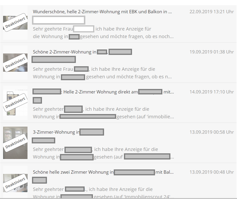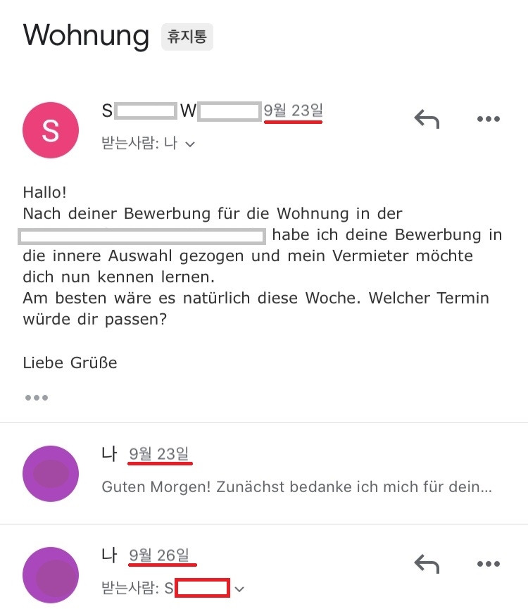 한 번은 사진에 보이는 것처럼 우리에게 집을 주고 싶으니 집주인과 약속을 잡자는 Vormieterin (이전 세입자)가 있었다. 행복에 겨운 마음으로 월요일에 답장을 했으나 금요일까지 2통의 이메일을 보내도 답이 없었고 나는 고 계집의 이름을 영원히 기억해두기로 했다.