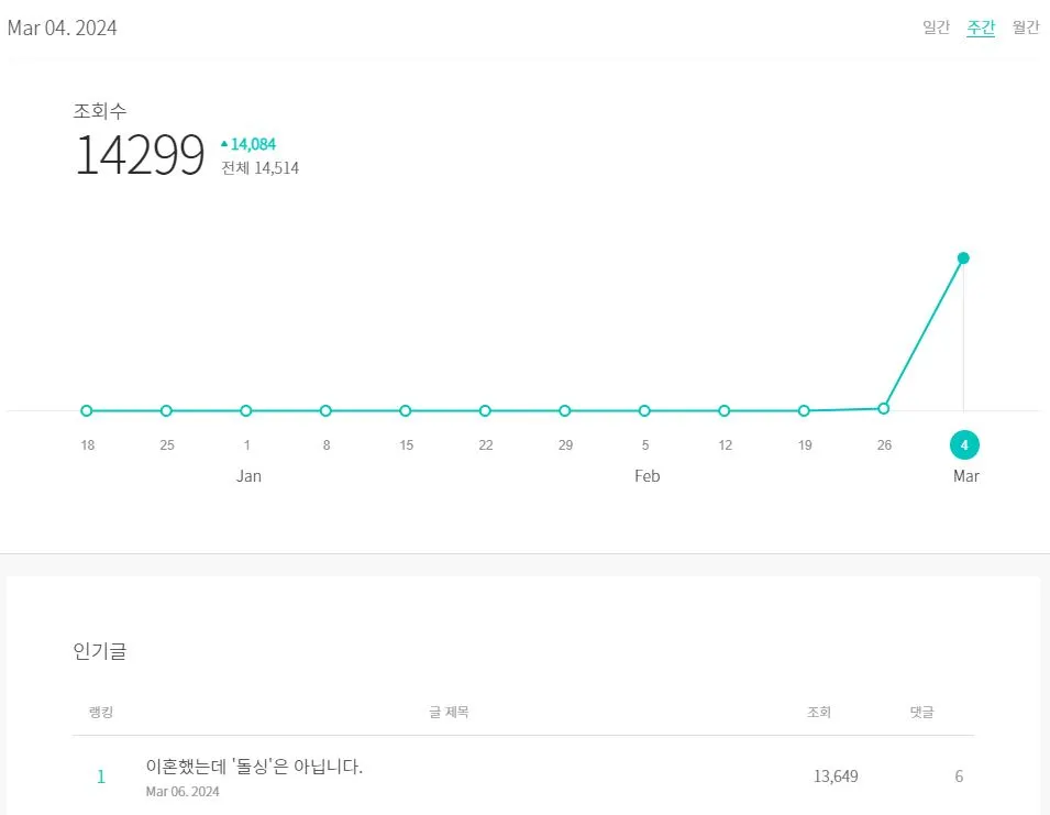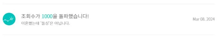 그중 이혼에 관한 두 번째 글 <이혼했는데 '돌싱'은 아닙니다>가 금요일 오후부터 갑자기 조회수 1,000을 돌파했다는 알림을 받았다. 뭘 잘못 봤나 싶어 보고 또 봤다.