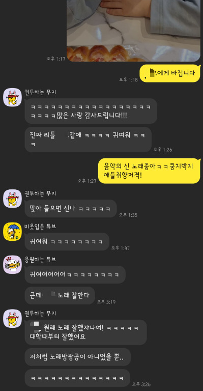엄마가 허밍 하는 것을 들은 아이가 노래를 뜨문뜨문 따라 부르기 시작했다. 특히 '쿵 치 팍 치' 부분이 나오면 입꼬리가 씩 올라가고 고개를 까딱거리며 좋아했다. 나는 그 모습이 귀여워서 동영상을 찍어 친한 대학 동기들과 선배 언니가 있는 단톡방에 올렸다.