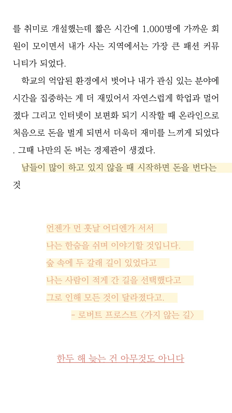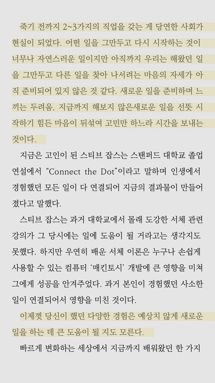 책을 읽었더니 작아지던 내가 다른 사람이 된 기분이었습니다. 내가 선택한 일이 멋져보이고, 대단해 보였어요. 지금 저에겐 이런 희망들과 응원의 메시지들이 필요했던거죠. 마음이 달라지니 세상이 달라보이기 시작합니다. 부수입으로 강의를 하는데, 강의를 하고 나면 요즘은 칭찬문과 반성문 중 반성문의 비중이 높아지던 찰나였거든요. 다 부족하기 짝이없어보이던 저. 그리고 이 일도 결국은 힘든 일이겠구나를 생각하니 미리 경험해서 다행이란 생각과 동시에 약간의 체념도 있었어요. 일을 시작한 초짜의 마음에 때가 묻은 기분. 그런데 이 책을 읽고 느껴지는 감정을 놓치고 싶지않아 노트를 펼쳐적었습니다.