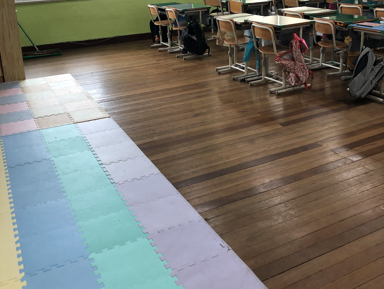 우리 반엔 특별한 놀이터가 있다. 교실 뒤편에 있던 사물함을 옆으로 옮겨버리고, 앉아서 편히 놀 수 있도록 매트를 깔아 두었다. 어디든 놀이터로 만들어버리는 아이들은 교실과 운동장 할 것 없이 잘 눕고, 앉아버린다. 옷이 더러워지거나 가시, 뾰족한 것에 노출되기 쉬워서 안전장치를 만든 것이다.