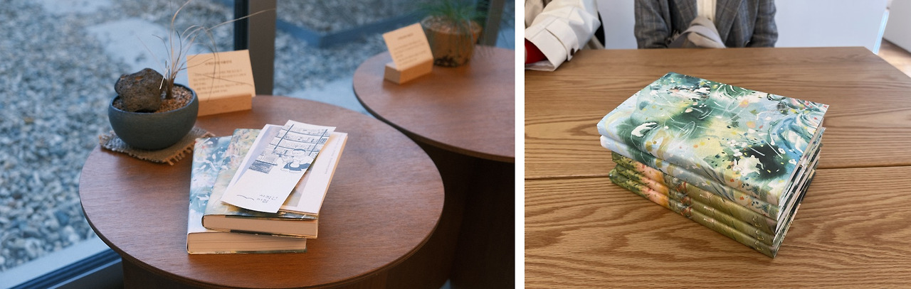 사적인 서점에 첫 번째 방문했을 때는 (지난 글에서 언급했던) 장류진 작가의 『우리가 반짝이는 계절』, 영화 <퍼펙트 라이프>에 나왔던 고다 아야의 에세이 『나무』를 구입했습니다. 그리고 두 번째 방문했을 때에는 가족들을 다 데리고 가서 제가 살 테니 한 권씩 책을 골라달라고 했어요. 한강 작가의 『빛과 실』, 로마노 과르디니의 『삶과 나이』, 허태임 식물학자의 『숲을 읽는 사람』, 최혜진 에디터의 『에디토리얼 싱킹』, 김민철 카피라이터의 『내 일로 건너가는 법』, 이렇게 다섯 권을 구매하게 됐죠. 책 큐레이션이 잘 되어 있어서 그런지, 다들 비교적 금방 금방 잘 고르더라고요. 사적인 서점에서는 책을 사면 그림이 프린트된 종이로 북커버를 만들어주십니다. 책을 읽을 때마다 파주에서 샀었지, 하고 기억하게 되어요.